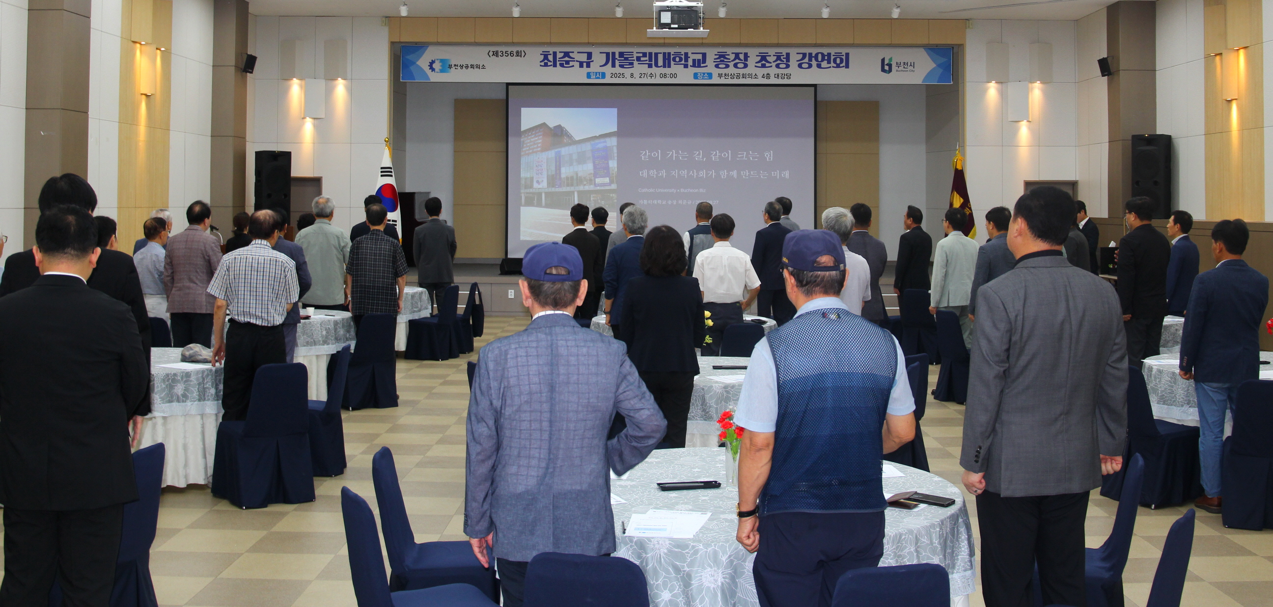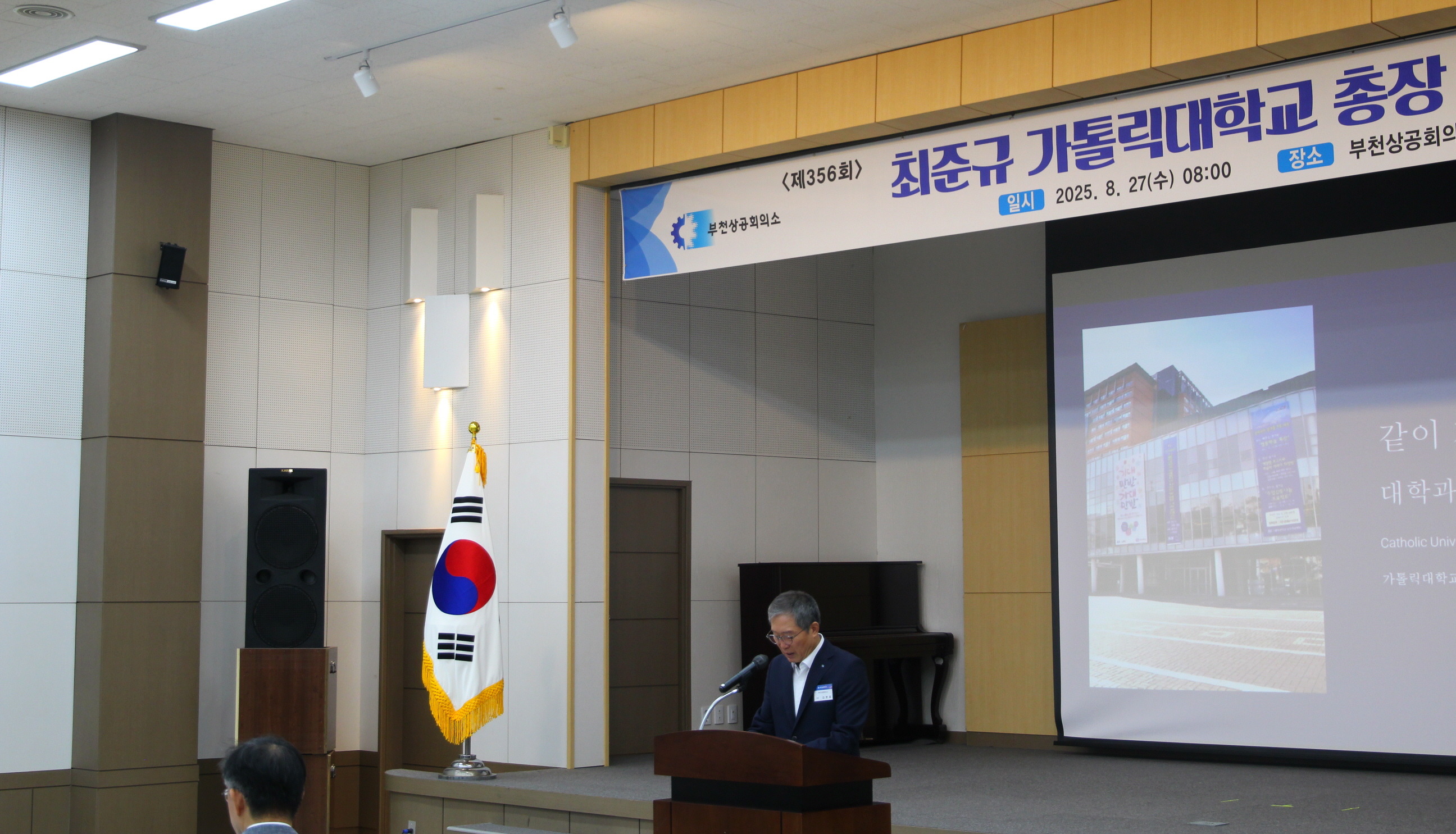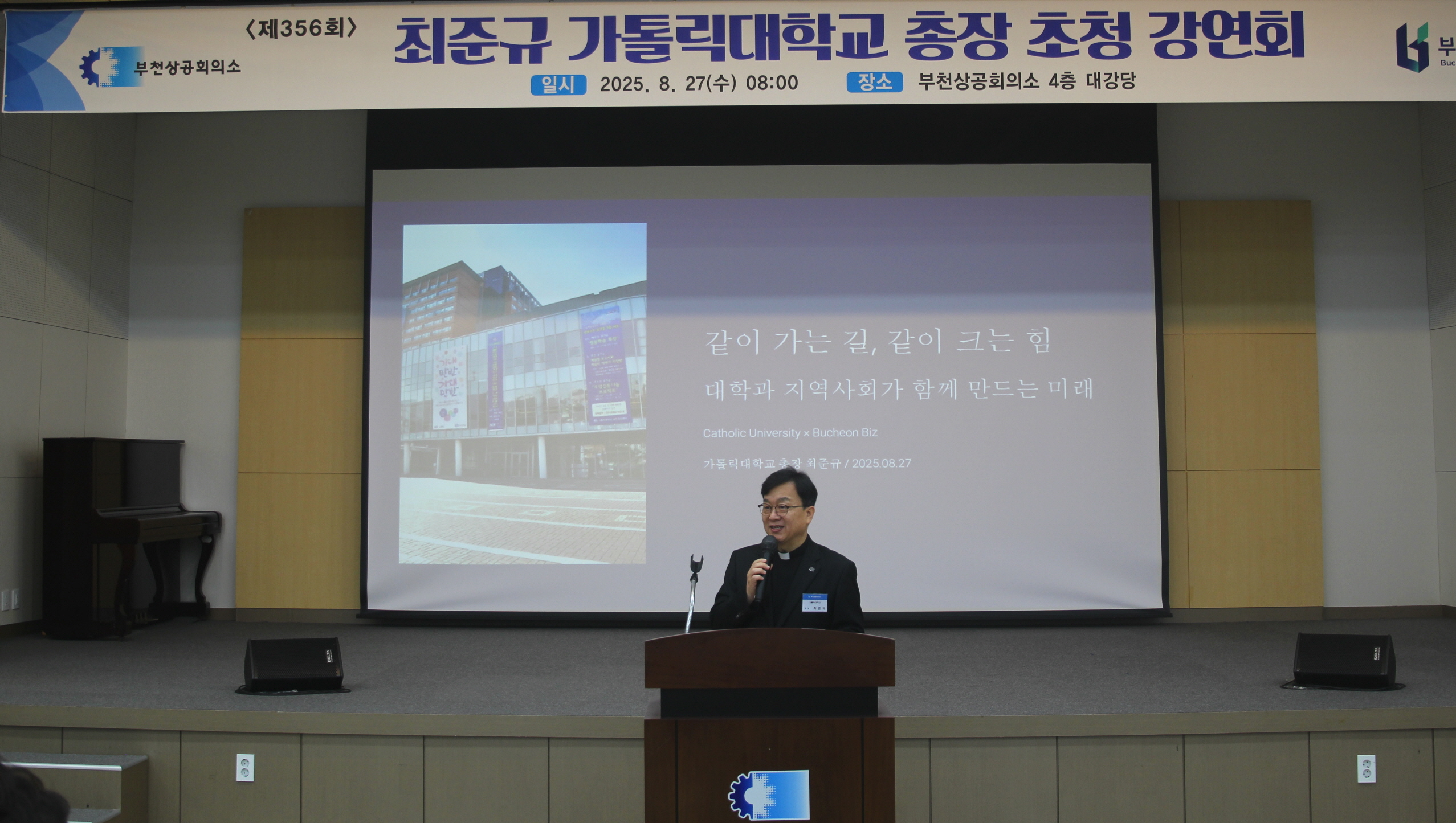부천상공회의소(회장 김종흠)는 8월 27일 오전 8시, 부천상공회의소 4층 대강당에서 『가톨릭대학교 총장 초청 제356회 강연회』를 개최했다.