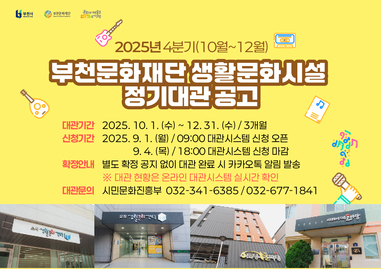 천문화재단(대표 한병환, 이하 재단)은 지역 생활문화동호회와 시민들의 자발적인 문화예술 활동을 지원하고자 2025년 4분기(10월~12월) 생활문화시설 정기대관 신청을 받는다.
