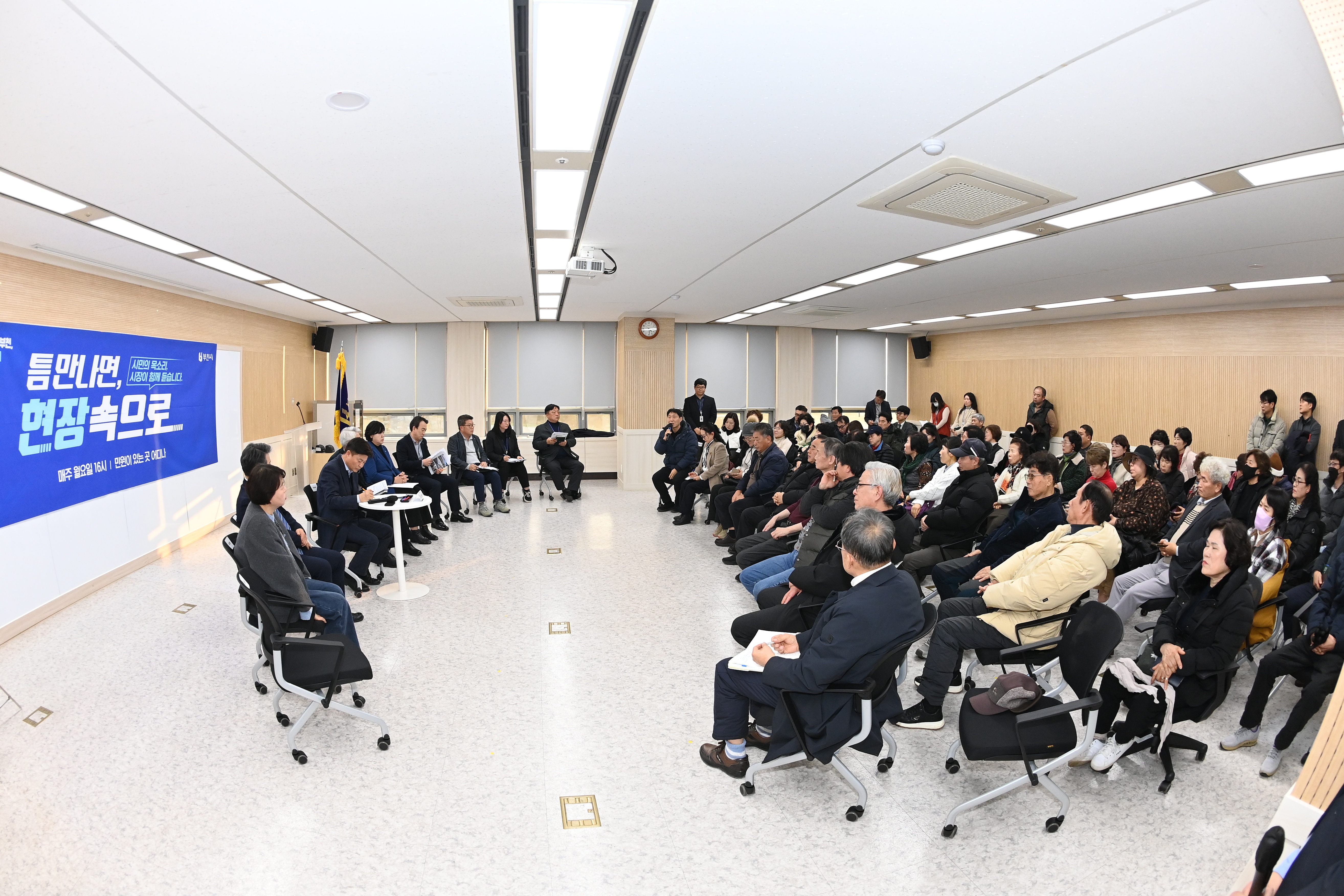 조용익 부천시장은 24일 오정구청 대회의실에서 제7차 ‘틈만나면, 현장속으로’를 열고, 경인고속도로 인근 소규모주택정비사업 구역의 방음벽 설치 민원 해결을 위한 주민 의견을 청취했다.