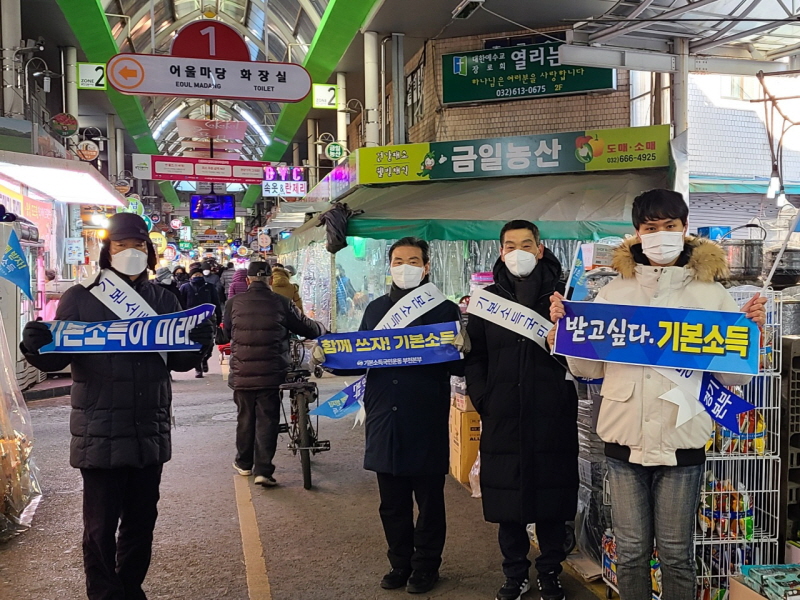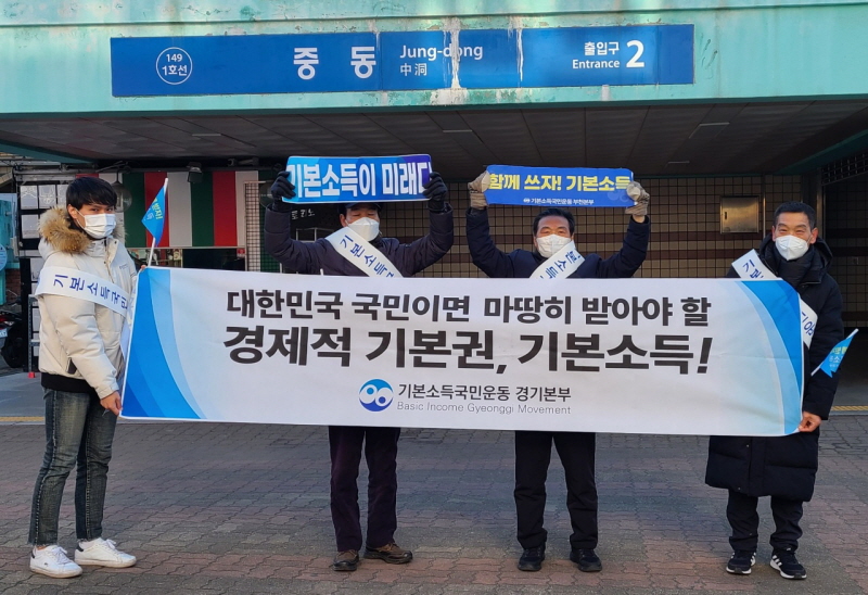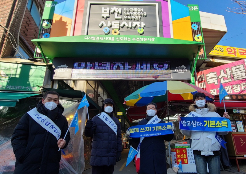기본소득국민운동 부천본부(상임대표 김명원 도의원) 회원들이 기본소득 법제화와 기본소득, 기본주택, 기본금융 등 경제적 기본권을 주장하며 기본소득 길거리 홍보전에 나서고 있다.
