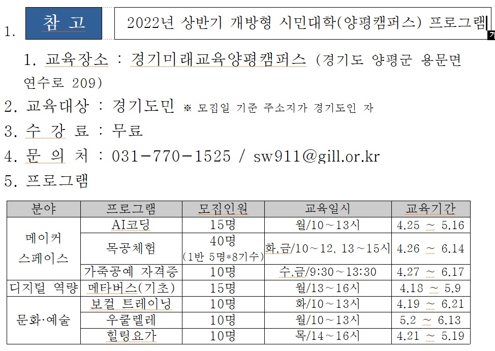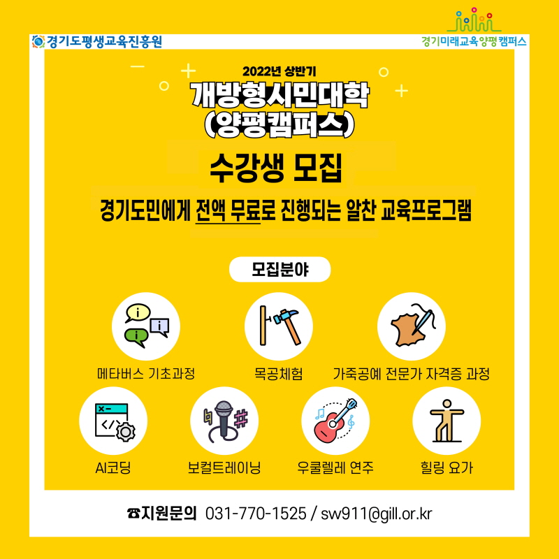 º°µµÀÇ ÀÚ°Ý»çÇ× ¾øÀÌ °æ±âµµ¹ÎÀÌ¸é ´©±¸³ª ¹«·á·Î ½ÅûÇÒ ¼ö ÀÖ´Ù. ÇÁ·Î±×·¥À̳ª ½Åû¹æ¹ý µî ¹®ÀÇ»çÇ×Àº ¾çÆòÄ·ÆÛ½º ±³À°¿î¿µÆÀ(031-770-1525)À¸·Î ¿¬¶ôÇÏ¸é µÈ´Ù.