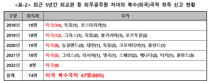 ÃÖ±Ù 5³â°£ ¿Ü±³°ü µî ¿Ü¹«°ø¹«¿ø ÀÚ³àÀÇ º¹¼ö(¿Ü±¹)±¹Àû ½Å±Ô Ãëµæ ½Å°íÀÚ 74¸íÀÇ ±¹ÀûÀ» »ìÆìº¸´Ï ¹Ì±¹ º¹¼ö±¹ÀûÀÚ´Â 50%À̰í Áö¼ÓÀûÀ¸·Î Áõ°¡Çϰí ÀÖ´Â °ÍÀ¸·Î È®ÀεǾú´Ù.