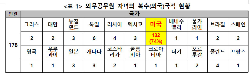 ¿Ü±³ºÎ °ø¹«¿øÀÇ º¹¼ö(¿Ü±¹)±¹Àû Àڳฦ ºÎ¸ðÀÇ Á÷±Þ º°·Î ºÐ·ùÇØº¸´Ï Àç¿Ü°ø°üÀå µî °íÀ§°ø¹«¿øÀÇ Àڳడ 41¸í, °úÀå±Þ ÀÌ»ó(7~9µî±Þ)ÀÇ Àڳడ 48¸í, 6µî±Þ ÀÌÇÏ Àڳడ 89¸íÀ¸·Î È®ÀεǾú´Ù.