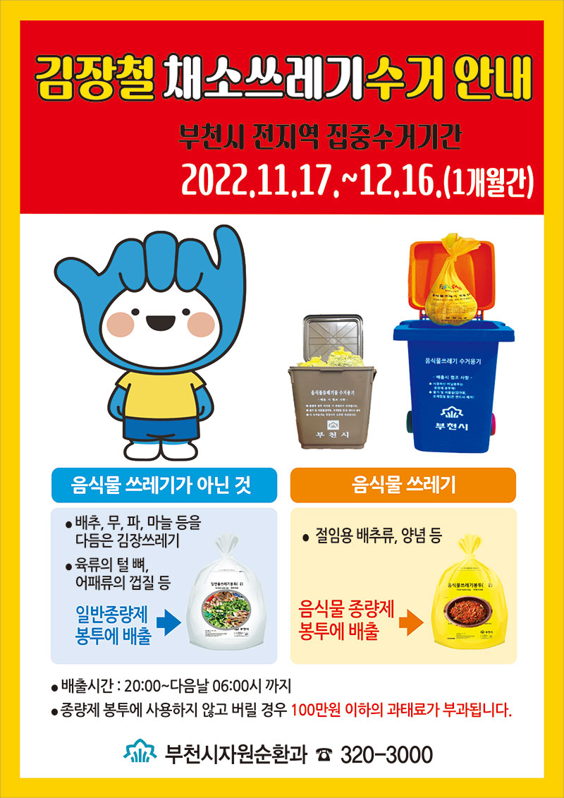 ºÎõ½Ã(½ÃÀå Á¶¿ëÀÍ)´Â 11¿ù 17ÀϺÎÅÍ 12¿ù 16ÀϱîÁö ±èÀåö ä¼Ò ¾²·¹±â ÁýÁß ¼ö°Å ±â°£À» ¿î¿µÇÏ°í ¿Ã¹Ù¸¥ ¹èÃâ ¹æ¹ýÀ» ÇÔ²² È«º¸ÇÑ´Ù.