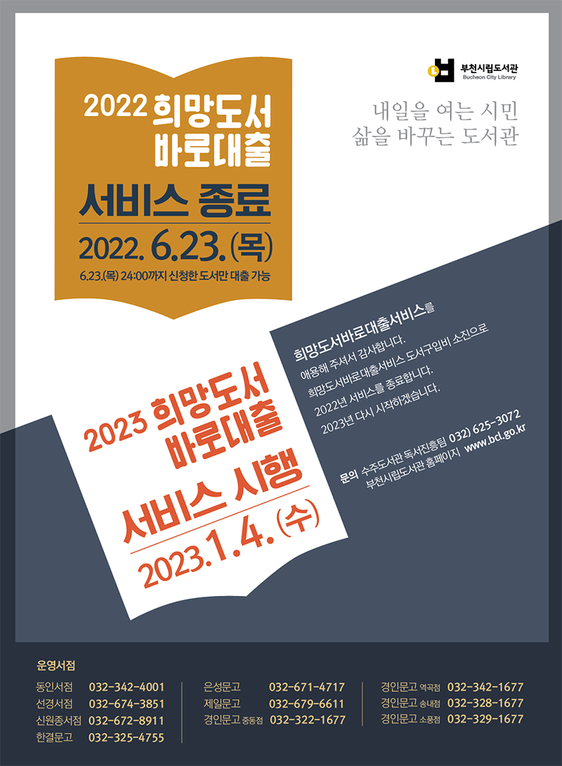 2022³â 6¿ù 23ÀÏ Èñ¸Áµµ¼­ ¹Ù·Î´ëÃâ Á¾·á ¾È³»¹® <ºÎõ½Ã¸³µµ¼­°ü>