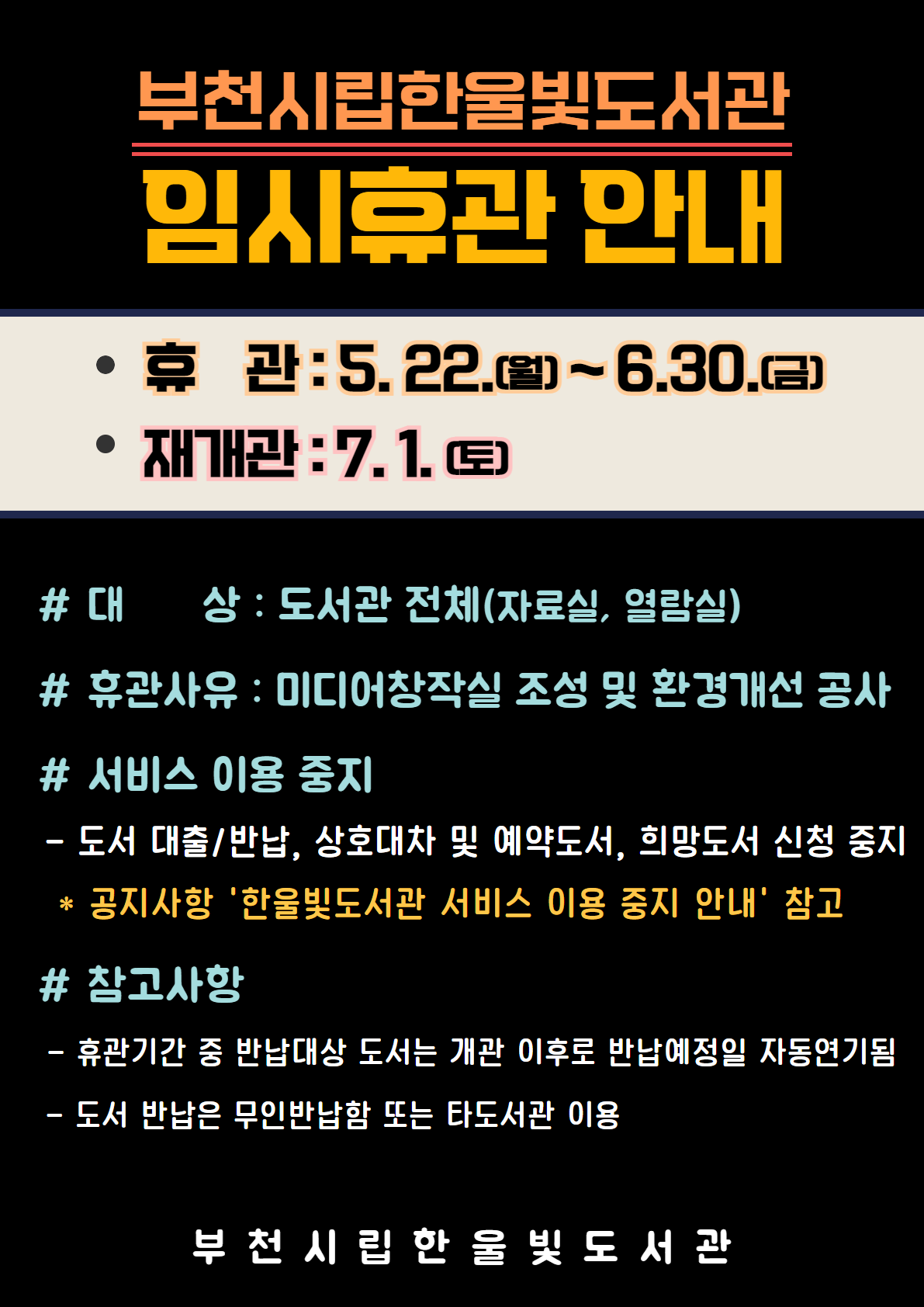 °ø»ç ±â°£Àº ¿À´Â 5¿ù 22ÀϺÎÅÍ 6¿ù 30ÀϱîÁöÀ̸ç, ÈÞ°ü±â°£ µ¿¾È ÇÑ¿ïºûµµ¼°ü ½Ã¼³ ¹× ÀÚ·á À̿뼺ñ½º(µµ¼ ´ëÃⷹݳ³, »óÈ£´ëÂ÷, ¿¹¾àµµ¼)´Â ¸ðµÎ ÀϽà ÁߴܵȴÙ. ´Ù¸¸, ¿Â¶óÀÎ(zoom)À» Ȱ¿ëÇÑ ºñ´ë¸é µ¶¼¹®È ÇÁ·Î±×·¥Àº Á¤»ó ¿î¿µµÈ´Ù.
