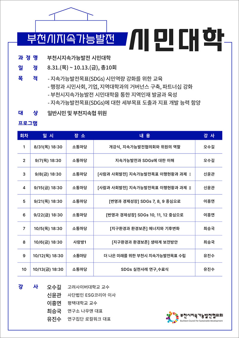 ƯÈ÷ ºÎõÁö¼ÓÇùÀº À̹ø ½Ã¹Î´ëÇÐ ¿î¿µÀ» ÅëÇØ SDGs ½Ã¹Î¿ª·® °È¸¦ À§ÇÑ ±³À°°ú ¸ðµ¨À» °³¹ßÇϰí, ÇàÁ¤°ú ½Ã¹Î»çȸ, ±â¾÷, Áö¿ª ´ëÇÐÀÇ °Å¹ö³Í½º¿Í ÆÄÆ®³Ê½Ê °È, Áö¿ªÀÎÀç ¹ß±¼°ú À°¼º, Áö¼Ó°¡´É¹ßÀü¸ñÇ¥(SDGs)¿¡ ´ëÇÑ ¼¼ºÎ¸ñÇ¥ µµÃâ°ú ÁöÇ¥°³¹ß ´É·Â ÇԾ翡 ¸ñÇ¥¸¦ µÎ°í ½Ç½ÃÇÑ´Ù.