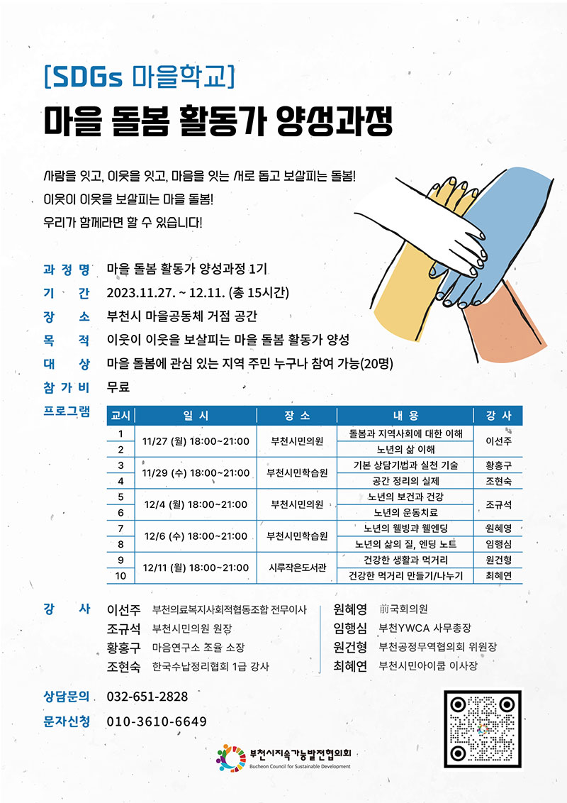 ºÎõ½ÃÁö¼Ó°¡´É¹ßÀüÇùÀÇȸ(´ëǥȸÀå Çã¿ø¹è, °øµ¿È¸Àå Á¶¿ëÀÍ, ÀÌÇÏ ºÎõÁö¼ÓÇù)´Â ¿À´Â 11¿ù 27ÀϺÎÅÍ 12¿ù 11ÀϱîÁö ¿ù, ¼ö Àú³á 3½Ã°£¾¿ 5ȸ¿¡ °ÉÃÄ “SDGs ¸¶À»Çб³ ¸¶À»µ¹º½ Ȱµ¿°¡” ¾ç¼º°úÁ¤À» ÁøÇàÇÑ´Ù.