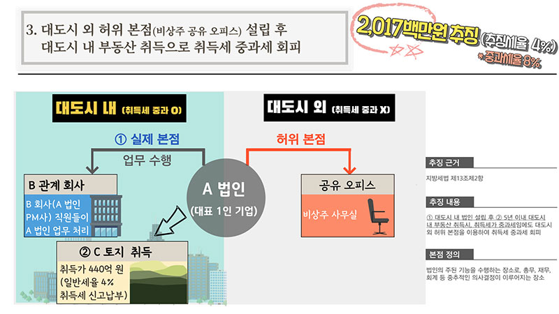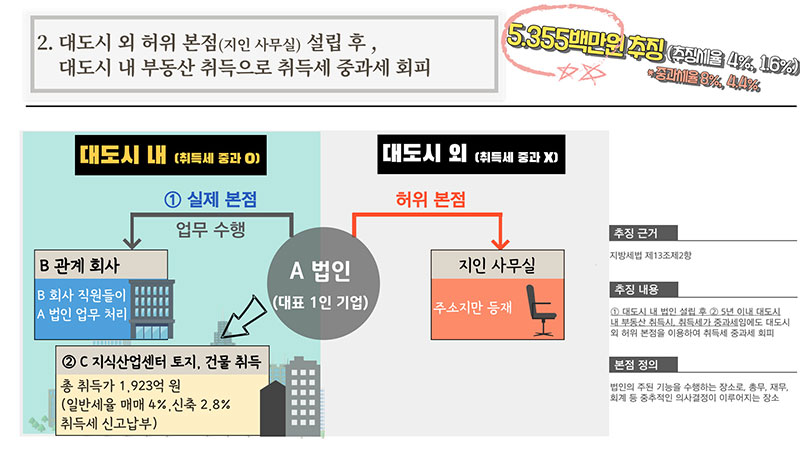 ´ëµµ½Ã ³» ºÎµ¿»êÀ» ÃëµæÇÑ ¹ýÀÎ µî(15°³)À» ´ë»óÀ¸·Î ¼¼¹«Á¶»ç¸¦ ½Ç½ÃÇÏ¿© 146¾ï ¿ø Ãß¡9°³ ¹ýÀο¡ ´ëÇÏ¿© Ãëµæ¼¼ Áß°ú¼¼ Å»·ç¼¼¾× 145¾ï ¿ø Ãß¡2°³ ¹ýÀο¡ ´ëÇÏ¿© Ãëµæ ºÎ´ëºñ¿ë(ÀÌÀÚ, ¼ö¼ö·á µî) ´©¶ô¿¡ µû¸¥ 1¾ï ¿ø Ãß¡°æ±âµµ°¡ ¹ýÀÎÀÇ º»Á¡ ÁÖ¼ÒÁö¸¦ ´ëµµ½Ã ¹ÛÀ¸·Î µîÀçÇÏ°í ½ÇÁ¦·Î´Â ´ëµµ½Ã ³»¿¡¼ º»Á¡ ¾÷¹«¸¦ ¼öÇàÇÏ¸é¼ ºÎµ¿»êÀ» ÃëµæÇØ Ãëµæ¼¼ Áß°ú¼¼¸¦ Å»·çÇÑ 11°³ ¹ýÀÎÀ» Àû¹ßÇØ 146¾ï ¿øÀ» Ãß¡Çß´Ù.