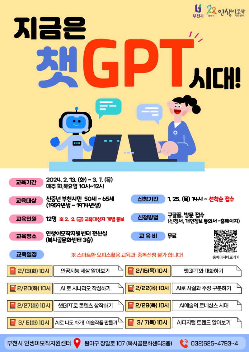 ‘Áö±ÝÀº êGPT ½Ã´ë!’, ‘½º¸¶Æ®ÇÑ ¿ÀÇǽº Ȱ¿ë’ °úÁ¤Àº ÀΰøÁö´É(AI)À» ÅëÇØ Á¤º¸¸¦ ¾ò°í ÄÜÅÙÃ÷ âÀÛ ¹× È¿À²ÀûÀÎ ¾÷¹« ó¸® ¹æ¹ýÀ» ¹è¿ï ¼ö ÀÖ´Â ±³À°À¸·Î 1¿ù 25ÀϺÎÅÍ ¼±Âø¼ø 12¸íÀ» ¸ðÁýÇÒ ¿¹Á¤ÀÌ´Ù. ±³À°Àº 2¿ù 13ÀϺÎÅÍ 3¿ù 7ÀϱîÁö ¸ÅÁÖ È¸ñ 8ȸ °úÁ¤À¸·Î ÁøÇàµÈ´Ù.