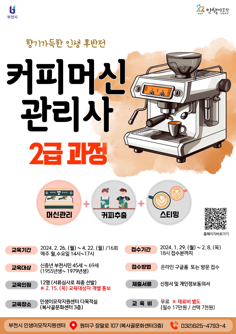 ‘Ä¿ÇǸӽŰü¸®»ç 2±Þ’ ±³À°³»¿ëÀº ¿¡½ºÇÁ·¹¼Ò ¸Ó½Å°ú Ä¿ÇÇ ±×¶óÀδõÀÇ ¼¼ÆÃ, û¼Ò, ¿î¿ë¹æ¹ý µîÀ¸·Î ±¸¼ºµÆ´Ù. ¸Ó½Å °ü¸®¸¦ ÅëÇØ Ä¿ÇÇ ¸ÀÀÇ ÁúÀ» ³ôÀ̰í, ¸Ó½Å °íÀå ½Ã Á÷Á¢ ¼ö¸®°¡ °¡´ÉÇØ Ä«Æä ¿î¿µÀڵ鿡°Ô À¯¿ëÇÑ ±³À°ÀÌ´Ù. 1¿ù 29ÀϺÎÅÍ 12¸íÀ» ¸ðÁýÇÒ ¿¹Á¤ÀÌ¸ç ±³À°Àº 2¿ù 26ÀϺÎÅÍ 4¿ù 22ÀϱîÁö ¸ÅÁÖ ¿ù¼ö 16ȸ °úÁ¤À¸·Î ÁøÇàµÈ´Ù.