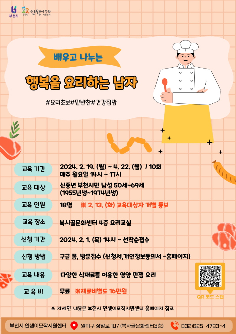 ‘ÇູÀ» ¿ä¸®ÇÏ´Â ³²ÀÚ’ ÇÁ·Î±×·¥Àº ¿ä¸®Ãʺ¸ 5060 ³²¼ºÀ» ´ë»óÀ¸·Î 2¿ù 1ÀϺÎÅÍ ¼±Âø¼ø 18¸íÀ» ¸ðÁýÇÑ´Ù. ±³À°Àº 2¿ù 19ÀϺÎÅÍ 4¿ù 22ÀϱîÁö ¸ÅÁÖ ¿ù¿äÀÏ 10ȸ °úÁ¤À¸·Î ÁøÇàµÈ´Ù.