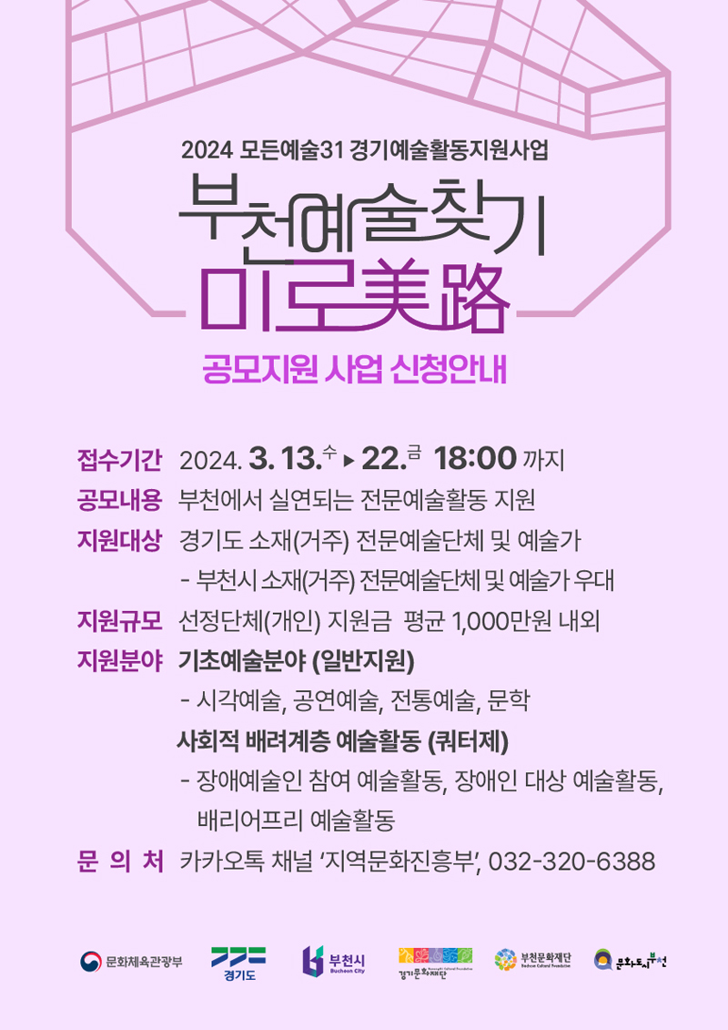 ºÎõ¹®ÈÀç´Ü(ÀÌÇÏ Àç´Ü)Àº 3¿ù 13ÀÏ(¼ö)ºÎÅÍ 3¿ù 22ÀÏ(±Ý) ¿ÀÈÄ 6½Ã±îÁö ‘2024 °æ±â¿¹¼úȰµ¿ Áö¿ø»ç¾÷ ¸ðµç¿¹¼ú31 : ºÎõ¿¹¼úã±â ¹Ì·Î(Ú¸ÖØ)’¿¡ Âü¿©ÇÒ ¿¹¼ú°¡¸¦ °ø°³ ¸ðÁýÇÑ´Ù. ‘ºÎõ¿¹¼úã±â ¹Ì·Î’´Â ºÎõ ¹®È°ø°£À̳ª Áö¿ª°øµ¿Ã¼¿Í ¿¬°èÇÑ ¿¹¼ú Ȱµ¿ Áö¿øÀ» ÅëÇØ ¿¹¼úÀÎÀÇ Ã¢ÀÛ ±âȸ¿Í ½Ã¹Î ¿¹¼ú ÇâÀ¯ ±âȸ¸¦ ´Ã¸®´Â »ç¾÷ÀÌ´Ù.