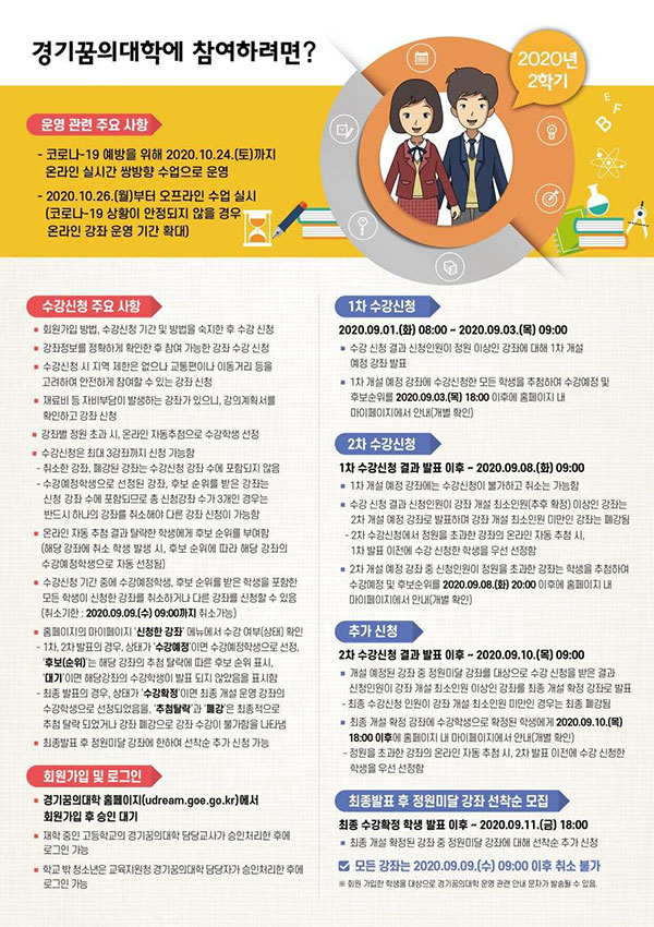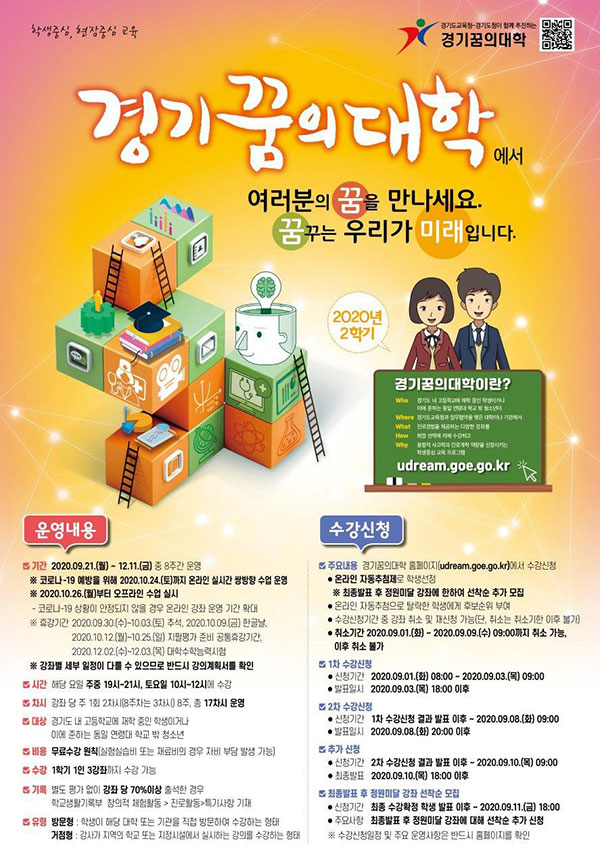 9¿ù 1ÀϺÎÅÍ 9¿ù 10ÀϱîÁö, °æ±â²ÞÀÇ´ëÇРȨÆäÀÌÁö¿¡¼ Çлý 1Àδç ÃÖ´ë 3°Á ¼ö° ½Åû2Çб⠹湮Çü °Á 704°³, °ÅÁ¡Çü 741°³ µî ÃÑ 1,445°³ °Á °³¼³ ¿¹Á¤, ¹«·á ¼ö° ¿øÄ¢ ¿Â¶óÀÎ ÀÚµ¿Ãß÷À¸·Î ¼ö° Çлý ¼±Á¤, 1Â÷ 9¿ù 3ÀÏ, 2Â÷ 9¿ù 8ÀÏ, Ãß°¡ 9¿ù 10ÀÏ ¼ö° ½Åû °á°ú ¹ßÇ¥°æ±âµµ±³À°Ã»(±³À°°¨.ÀÌÀçÁ¤)ÀÌ 9¿ù 1ÀϺÎÅÍ 10ÀϱîÁö µµ³» °íµîÇлý°ú Çб³ ¹Û û¼Ò³âÀ» ´ë»óÀ¸·Î ‘2020 °æ±â²ÞÀÇ´ëÇÐ 2Çб⠼ö° ½Åû’À» ¹Þ´Â´Ù.