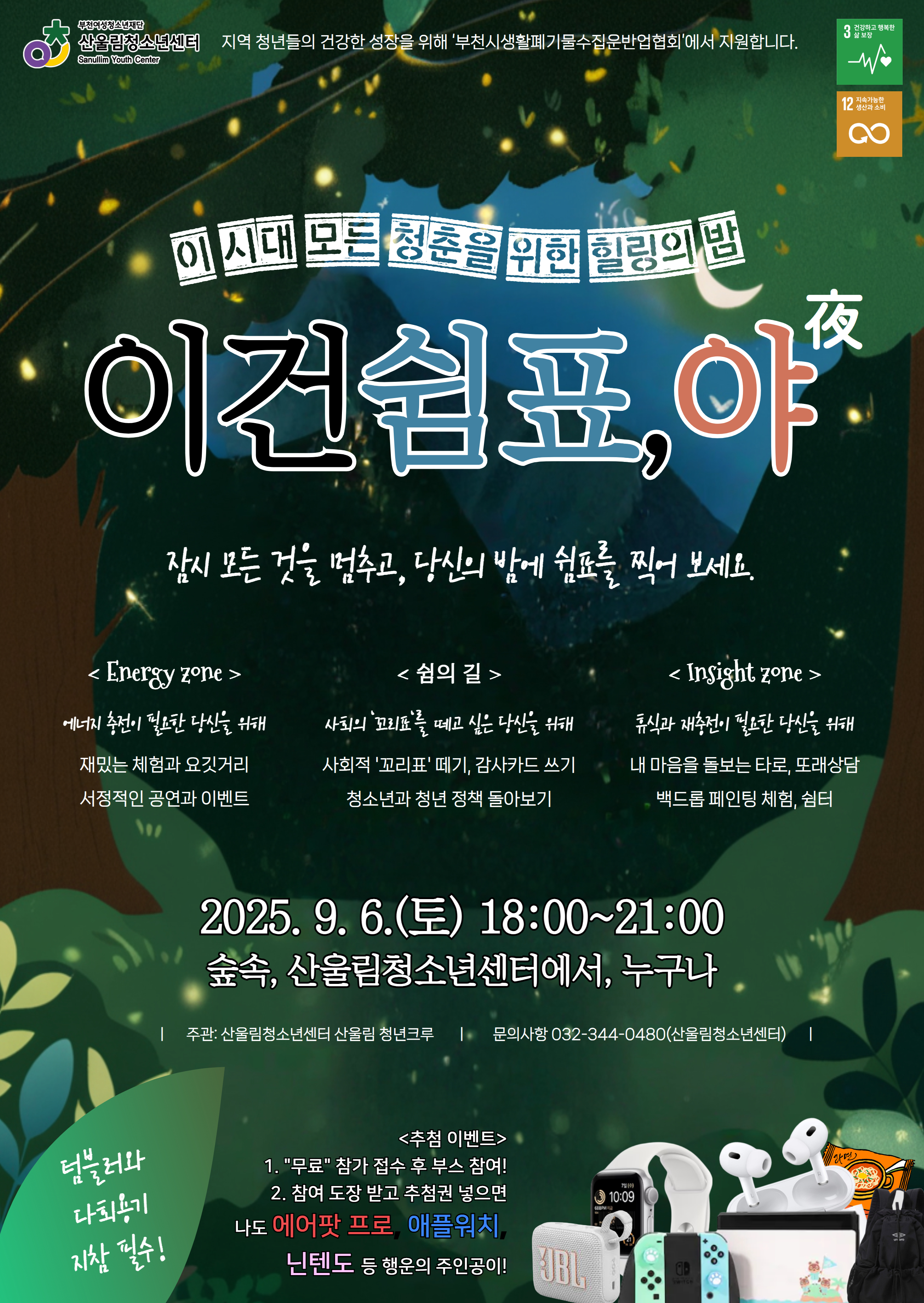 - ½Ã¹ÎÀ» À§ÇÑ Æ¯º°ÇÑ ÇÏ·í¹ãÀÇ ½° ¡®ÀÌ°Ç ½°Ç¥, ¾ß(å¨)¡¯ºÎõ¿©¼ºÃ»¼Ò³âÀç´Ü(´ëÇ¥ÀÌ»ç À̰ÀÎ)ÀÌ ¿î¿µÇÏ´Â »ê¿ï¸²Ã»¼Ò³â¼¾ÅÍ´Â ¿À´Â 9¿ù 6ÀÏ(Åä) Àú³á 6½ÃºÎÅÍ, °æÀï°ú ¼º°ú ¾Ð¹Ú¿¡ ÁöÄ£ û¼Ò³â, û³â µî ½Ã¹ÎµéÀ» À§ÇÑ Èú¸µ ¹®È ÃàÁ¦ ‘Èú¸µÀÇ ¹ã-¡¸ÀÌ°Ç ½°Ç¥, ¾ß(å¨)¡¹’¸¦ °³ÃÖÇÑ´Ù°í ¹àÇû´Ù.
