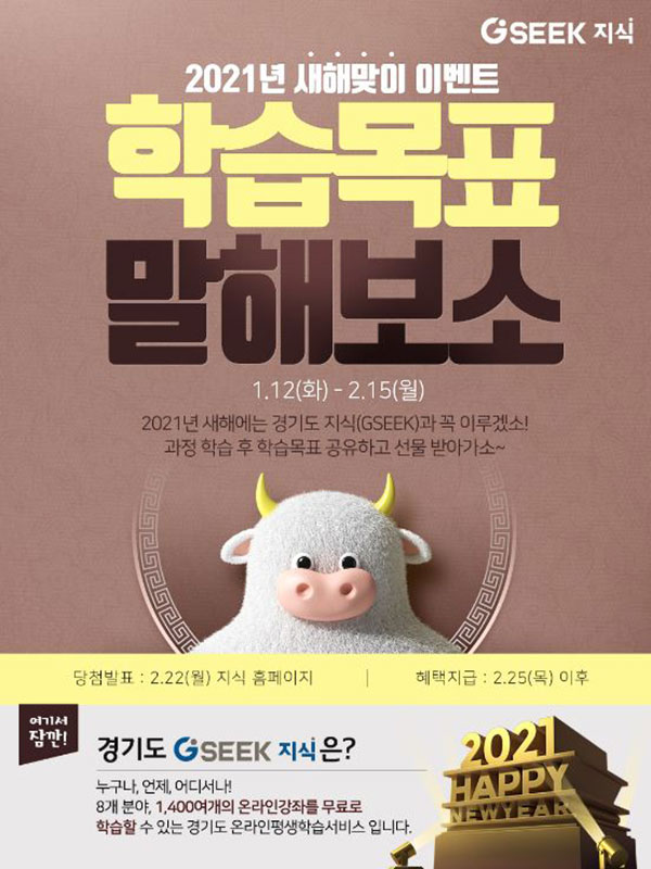 ÇÑÆí, Áö½Ä(GSEEK)Àº ¿À´Â 2¿ù 15ÀϱîÁö ‘ÇнÀ¸ñÇ¥ ¸»Çغ¸¼Ò’¸¦ ÁÖÁ¦·Î ¿Â¶óÀÎ Çà»ç¸¦ ÁøÇàÇÑ´Ù. ½Å±Ô·±âÁ¸ °úÁ¤ ±¸ºÐ ¾øÀÌ 3°³ °Á¸¦ ¼ö·áÇϰí ÇнÀÈıâ¿Í ÇнÀ¸ñÇ¥¸¦ ÀÛ¼ºÇÑ ÀÌ¿ëÀÚ Áß 200¸íÀ» ÃßÃ·ÇØ Áö¿ªÈÆó, ¸ð¹ÙÀÏ Ä¿ÇÇ ÄíÆù µîÀ» Á¦°øÇÑ´Ù.