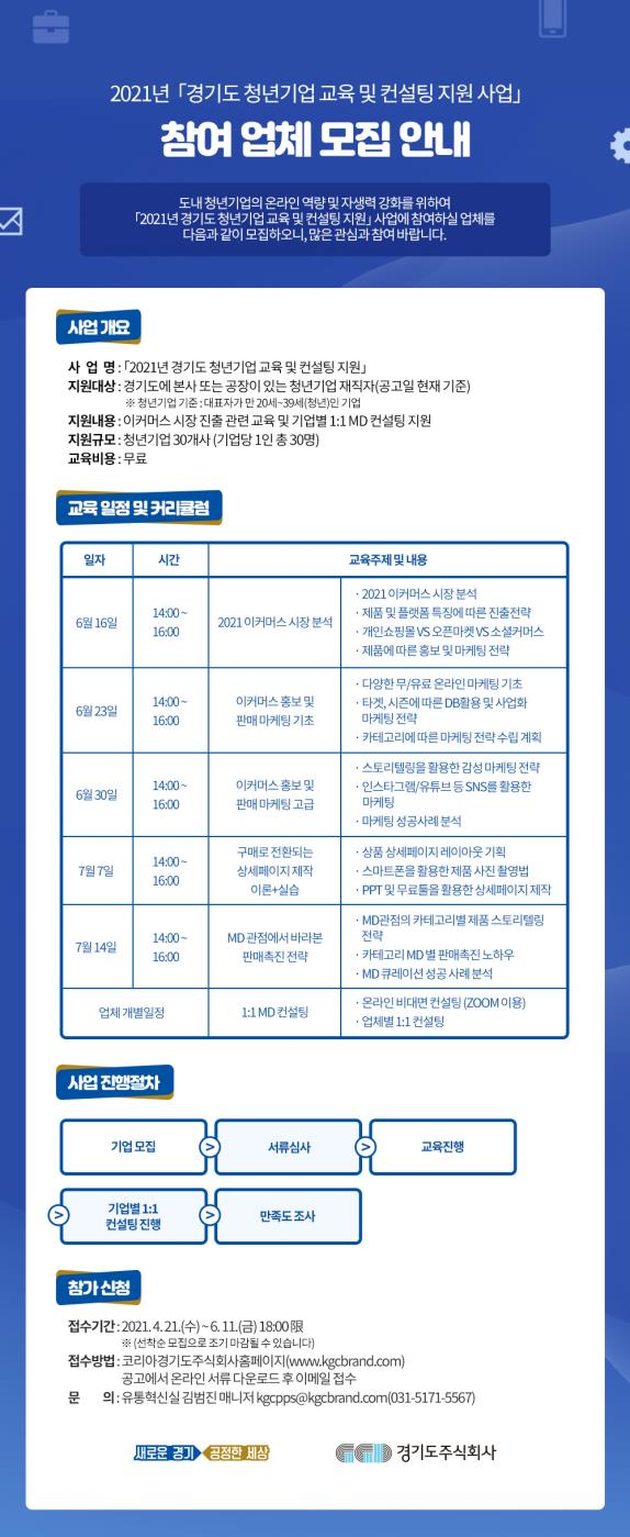 ¡®2021³â °æ±âµµ û³â±â¾÷ ±³À° ¹× ÄÁ¼³ÆÃ Áö¿ø¡¯ »ç¾÷ ÃßÁøÀÌ(E)-Ä¿¸Ó½º ½ÃÀå ÁøÃâ Á¦¹Ý ±³À° ¹× 1:1 MD ÄÁ¼³ÆÃ Á¦°ø¿À´Â 6¿ù 11ÀÏ ¿ÀÈÄ 6½Ã±îÁö Á¢¼ö °¡´É¡¦30°³ ±â¾÷ ¸ðÁý°æ±âµµ¿Í °æ±âµµÁÖ½Äȸ»ç°¡ µµ³» û³â±â¾÷ÀÇ ÀÌ(E)-Ä¿¸Ó½º ½ÃÀå ÁøÃâ¿¡ ÇÊ¿äÇÑ ¿ª·®°ú ÀÚ»ý·Â °È¸¦ À§ÇØ ³ª¼±´Ù.