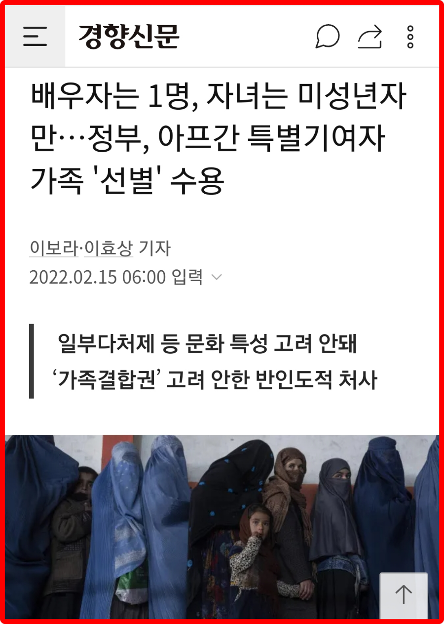 °æÇâ½Å¹® º¸µµ¿¡ µû¸£¸é Çѱ¹ Á¤ºÎ°¡ Áö³­ ÇØ ¾ÆÇÁ°£ »çÅ¿¡¼­ Ưº°±â¿©ÀÚ¸¦ Èù±¹À¸·Î µ¥·Á¿Ã ¶§, ¾ÆÇÁ°£ 1ºÎ´Ùó ¹®È­¸¦ ¹«½ÃÇÏ°í ¹è¿ìÀÚ 1¸í, ºÎ¸ð, ¹Ì¼º³âÀÚ¸¸ µ¿¹ÝÇϵµ·Ï Çß´Ù´Â °Ì´Ï´Ù.