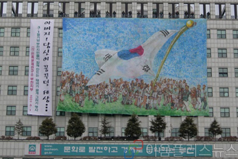 ºÎõ½Ã¹ÎºÐµé°ú ȸ¿ø µî 500¿©¸íÀÌ Á÷Á¢ Âü¿©ÇÏ¿© (ͺ)Á¶¿ùÈñÀÛ°¡°¡ ±âȹÇÑ Å±ر⠹ر׸§¿¡ ¼Ò¸ÁÇÏ´Â ±Û±Í¿Í ¼¸íÀ» ´ã¾Æ °É°³±×¸²À» Á¦ÀÛÇÏ¿´´Ù. °¡·Î30m ¼¼·Î20m¿¡ ´ÞÇÏ´Â ÃÊ´ëÇü űر⠰ɰ³±×¸²Àº Çà»ç¿¡ Âü¼®ÇÑ Âü¼®ÀÚµéÀÌ Å±ر⸦ ¸»¾Æ ¾î±ú¿¡ ¸Þ°í ½Ãû Àܵð±¤ÀåÀ» ¼¼¹ÙÄû µ· ÈÄ Çѱ¹³ëÃѺÎõÁöºÎ, ºÎõ½Ã°ø¹«¿ø³ëÁ¶, ÇØº´Àü¿ìȸÀÇ µµ¿òÀ» ¹Þ¾Æ ºÎõ½Ãû ºÏÃø º®¸é¿¡ °Ô¾çµÇ¾ú´Ù.