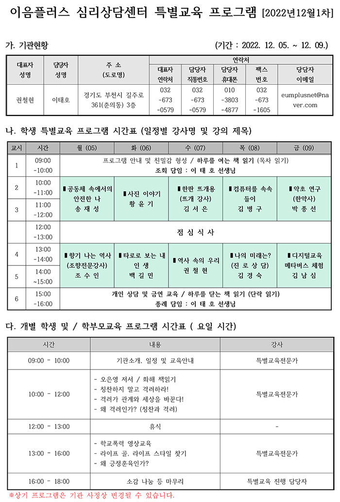 ÀÌÀ½Ç÷¯½º 12¿ù2Â÷ Ưº°±³À° ÀÏÁ¤.