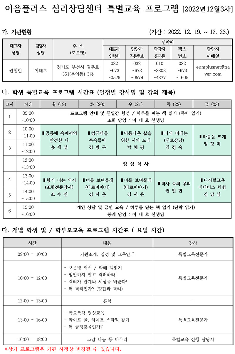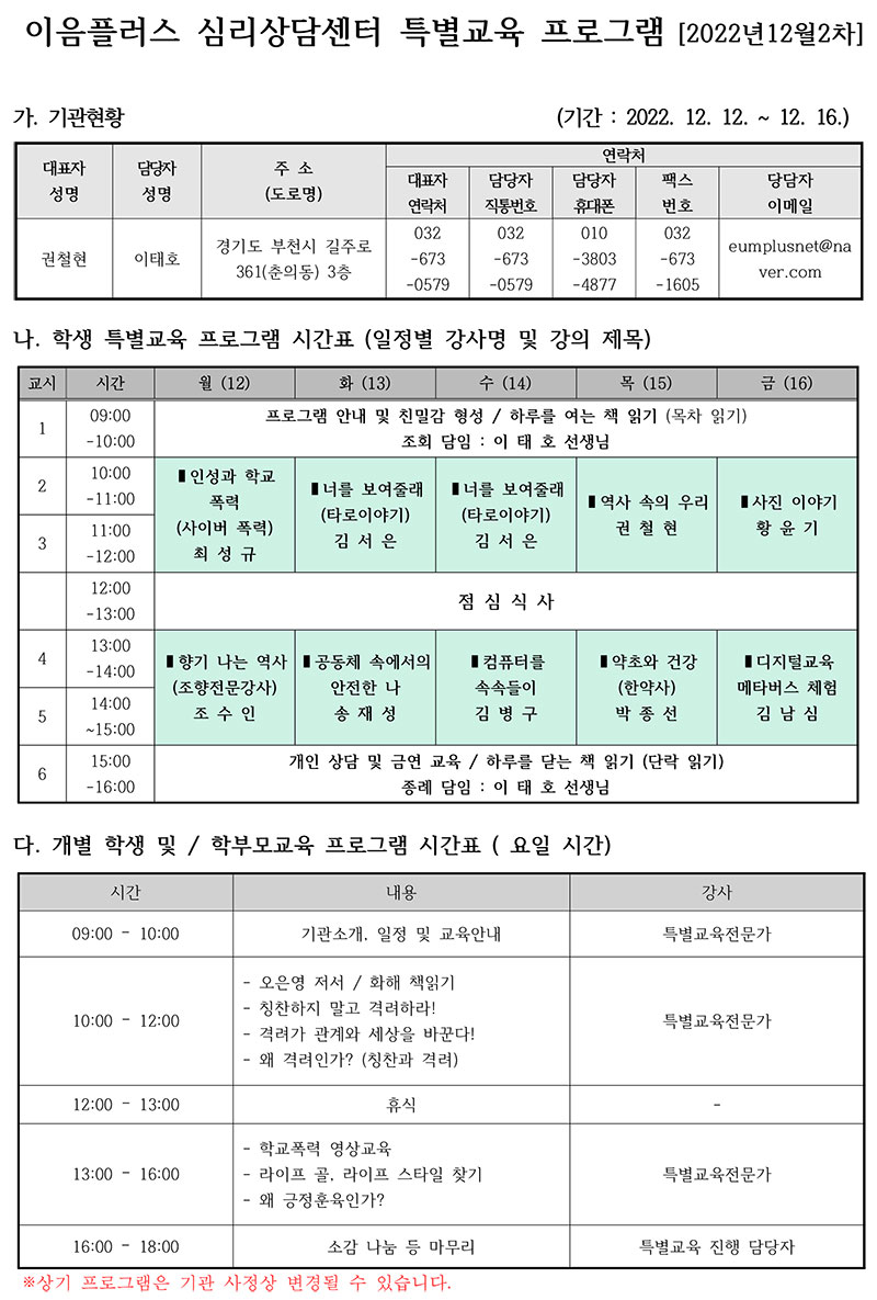 °æ±âµµ±³À°Ã» ÁöÁ¤ ´ë¾È±³À° À§Å¹ ±³À°±â°ü(Ưº°±³À° À̼ö±â°ü)ÀÎ 'ÀÌÀ½Ç÷¯½º ½É¸®»ó´ã¼¾ÅÍ'¿¡¼­ ÁøÇàÇÏ´Â 12¿ù Ưº°±³À° ÀÏÁ¤À» ¾È³»ÇÕ´Ï´Ù.