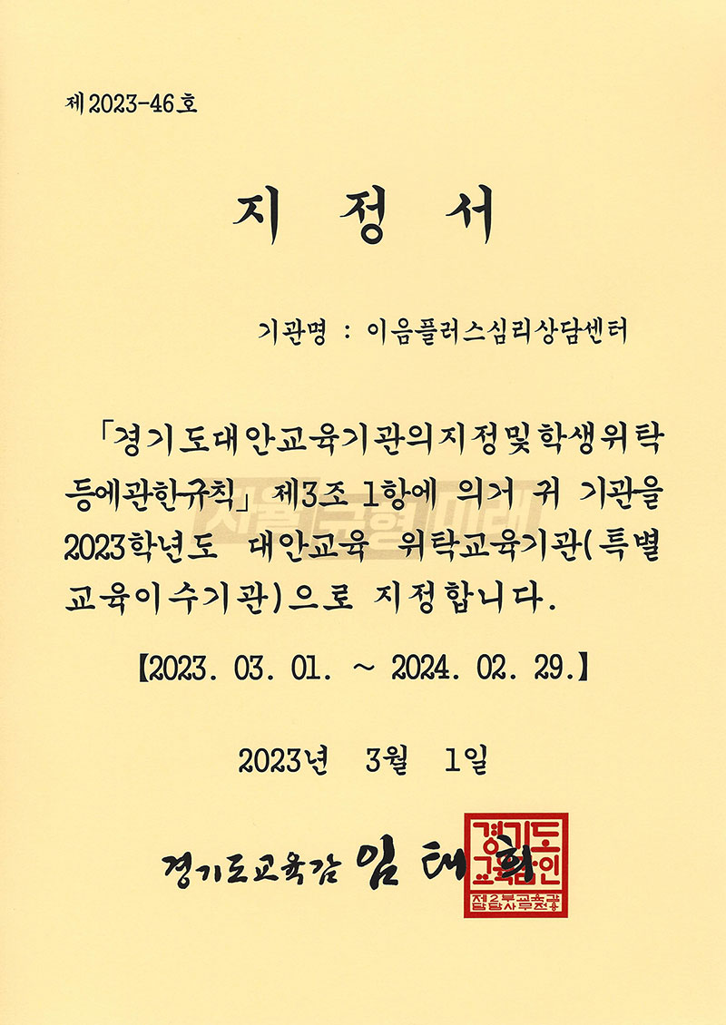 ÀÌÀ½Ç÷¯½º½É¸®»ó´ã¼¾ÅͰ¡ °æ±âµµ±³À°Ã»À¸·ÎºÎÅÍ 2023Çг⵵ ´ë¾È±³À° À§Å¹±³À°±â°ü(Ưº°±³À°À̼ö±â°ü)À¸·Î ÁöÁ¤µÇ¾ú´Ù.