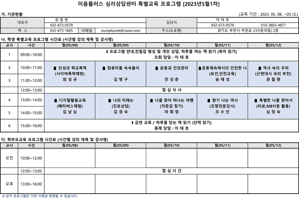 1Â÷ 5.8(¿ù)~12(±Ý) °æ±âµµ±³À°Ã»¡¤ÀÎõ°¡Á¤¹ý¿ø ÁöÁ¤, Ưº°±³À° À̼ö±â°ü 'ÀÌÀ½Ç÷¯½º½É¸®»ó´ã¼¾ÅÍ'2Â÷ 5.22(¿ù)~26(±Ý)°æ±âµµ±³À°Ã» ÁöÁ¤ ´ë¾È±³À° À§Å¹ ±³À°±â°ü(Ưº°±³À° À̼ö±â°ü)ÀÎ 'ÀÌÀ½Ç÷¯½º½É¸®»ó´ã¼¾ÅÍ'¿¡¼ ÁøÇàÇÏ´Â 2023³â 5¿ù Ưº°±³À° ÀÏÁ¤ ¹× ÇÁ·Î±×·¥À» ¾È³»ÇÕ´Ï´Ù.