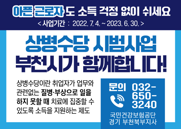 »óº´¼ö´çÀ̶õ ±Ù·ÎÀÚ°¡ ¾÷¹«¿Í °ü·Ã ¾ø´Â ºÎ»ó·Áúº´À¸·Î °æÁ¦ Ȱµ¿ÀÌ ¾î·Á¿î °æ¿ì Ä¡·á¿¡ ÁýÁßÇÒ ¼ö ÀÖµµ·Ï ¼ÒµæÀ» º¸ÀüÇÏ´Â Á¦µµ·Î, ºÎõ½Ã´Â Áö³ 4¿ù º¸°Çº¹ÁöºÎÀÇ ½Ã¹ü»ç¾÷ Áö¿ª°ø¸ð¿¡ ÃÖÁ¾ ¼±Á¤µÈ ¹Ù ÀÖ´Ù.