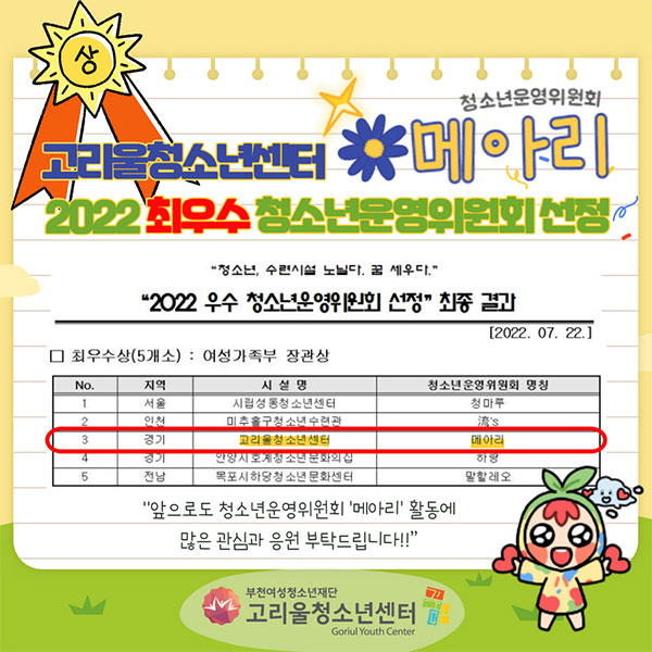 °í¸®¿ïû¼Ò³â¼¾ÅÍ Ã»¼Ò³â¿î¿µÀ§ ¡®¸Þ¾Æ¸®¡¯ 2022³â Àü±¹ ÃÖ¿ì¼ö û¼Ò³â¿î¿µÀ§¿øÈ¸·Î ¼±Á¤
