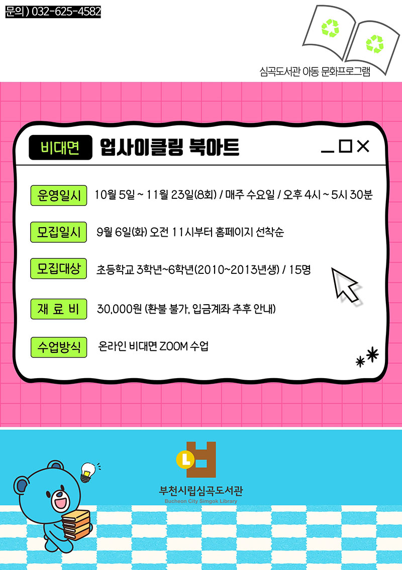 ÀÚ¼¼ÇÑ »çÇ×Àº ºÎõ½Ã¸³µµ¼°ü ȨÆäÀÌÁö(www.bcl.go.kr)¸¦ Âü°íÇϰųª ½É°îµµ¼°ü(032-625-4582)¿¡ ¹®ÀÇÇÏ¸é µÈ´Ù.