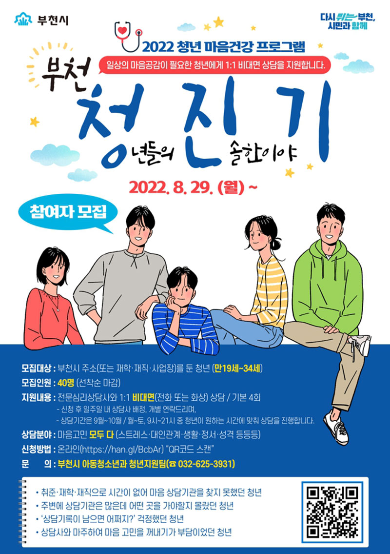 ¸¶À½°Ç° »ó´ãÀ» ¿øÇÏ´Â ¸¸19~34¼¼ÀÇ ºÎõ û³â ´©±¸³ª Âü¿© °¡´ÉºÎõ½Ã(½ÃÀå Á¶¿ëÀÍ)´Â 2022, û³â ¸¶À½°Ç° ÇÁ·Î±×·¥ 'ºÎõ ûÁø±â'ÀÇ Âü¿©ÀÚ¸¦ ¸ðÁýÇÑ´Ù.