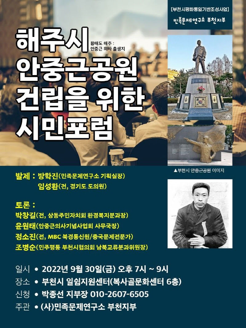¾ÈÁß±Ù ÀÇ»çÀÇ Ãâ»ýÁöÀÎ È²ÇØµµ ÇØÁֽÿ¡ '¾ÈÁß±Ù°ø¿ø'À» °Ç¸³ÇÏÀÚ´Â ÃëÁö·Î ÁøÇàµÇ´Â À̹ø Æ÷·³¿¡´Â ¹æÇÐÁø ¹ÎÁ·¹®Á¦¿¬±¸¼Ò ±âȹ½ÇÀå°ú ÀÓ¼ºÈ¯ Àü °æ±âµµÀÇ¿øÀÌ ¹ßÁ¦¸¦ ÇÏ°í ¹Úâ±æ Àü »óµ¿µ¿ÁÖ¹ÎÀÚġȸ ȯ°æº¹ÁøºÐ°úÀå, À±¿øÅ ¾ÈÁß±Ù±â³ä»ç¾÷ȸ »ç¹«±¹Àå, Á¤¼ÒÁø Áß±¹¹®Á¦Àü¹®°¡(Àü MBC ºÏ°æÅë½Å¿ø), Á¶º´¼ø ¹ÎÁÖÆòÅë ºÎõ½ÃÇùÀÇȸ ³²ºÏ±³·ùºÐ°úÀ§¿øÀåÀÌ Åä·Ð¿¡ Âü¿©ÇÑ´Ù.