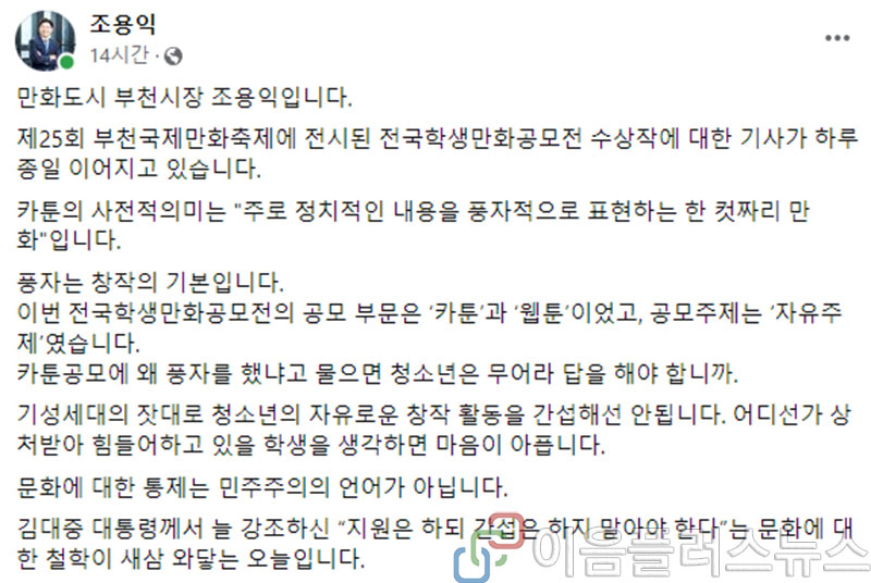 ¡®¹®È¿¡ ´ëÇÑ ÅëÁ¦´Â ¹ÎÁÖÁÖÀÇÀÇ ¾ð¾î°¡ ¾Æ´Ï´Ù¡¯°í ºñÆÇÁ¶¿ëÀÍ ºÎõ½ÃÀåÀº Àü±¹Çлý¸¸È°ø¸ðÀü¿¡¼ ±Ý»óÀ» ¼ö»óÇÏ°í ºÎõ±¹Á¦¸¸ÈÃàÁ¦¿¡¼ Àü½ÃµÈ °íµîÇлýÀÇ ¸¸È ÀÛǰÀÎ ‘À±¼®¿ ´ëÅë·É dzÀÚ¸¸È’¿¡ ´ëÇÑ ¹®ÈüÀ°°ü±¤ºÎ(ÀÌÇÏ ¹®Ã¼ºÎ)ÀÇ °°æ ´ëÀÀ¿¡ "¹®È¿¡ ´ëÇÑ ÅëÁ¦´Â ¹ÎÁÖÁÖÀÇÀÇ ¾ð¾î°¡ ¾Æ´Ï´Ù"¶ó°í ºñÆÇÇß´Ù.