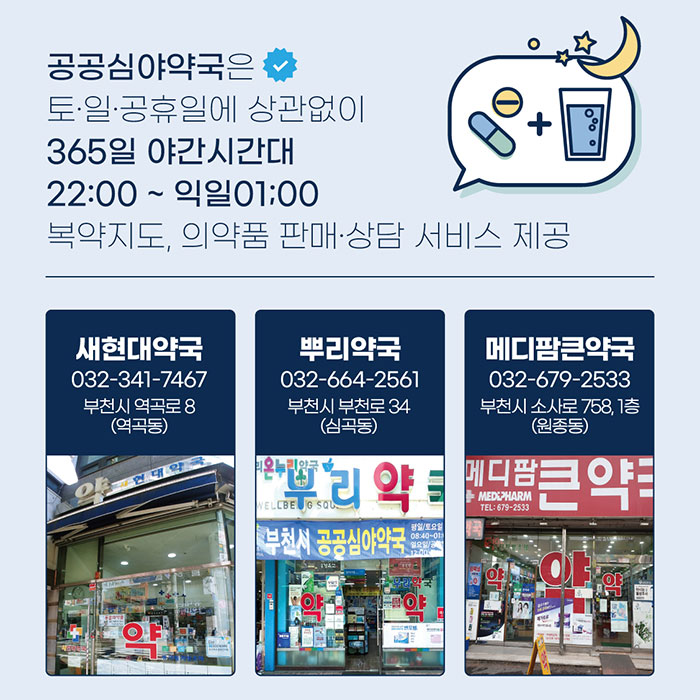 °ø°ø½É¾ß¾à±¹Àº ½É¾ß½Ã°£°ú ÈÞÀÏ¿¡µµ ½Ã¹ÎµéÀÇ ÀǾàǰ ±¸ÀÔ ºÒÆíÀ» ÇØ¼ÒÇϰí Àü¹®¾à»çÀÇ º¹¾àÁöµµ¸¦ ÅëÇØ ÀǾàǰ ¿À³²¿ë ¹× ºÎÀÛ¿ëÀ» ÃÖ¼ÒÈ­Çϱâ À§ÇØ 365ÀÏ ¿î¿µµÇ´Â ¾à±¹À¸·Î, ¿ÀÈÄ 10½ÃºÎÅÍ ´ÙÀ½³¯ »õº® 1½Ã±îÁö ¿î¿µµÈ´Ù.