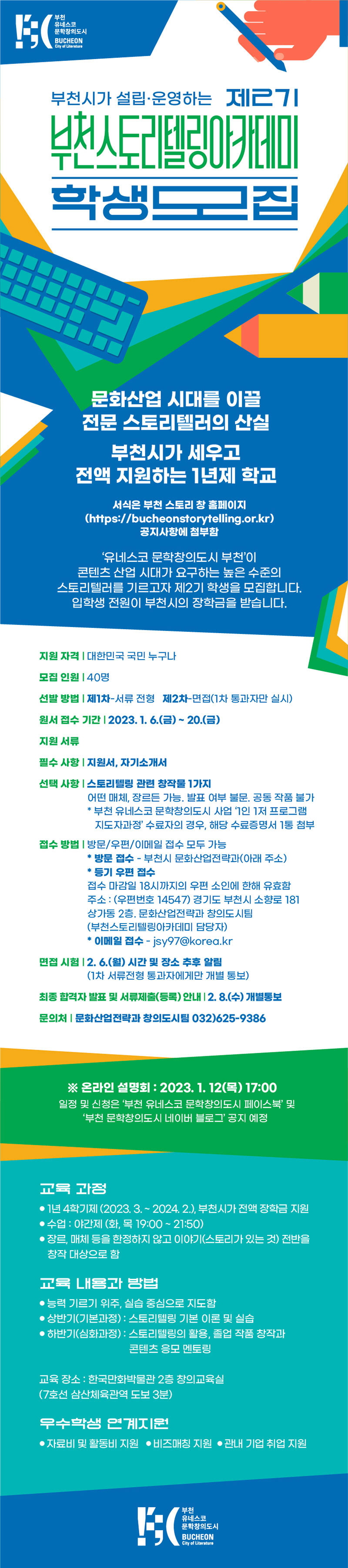 ÀÚ¼¼ÇÑ »çÇ×Àº ºÎõ½ºÅ丮ÅÚ¸µ ȨÆäÀÌÁö â(https://bucheonstorytelling.or.kr/), ºÎõ½Ã À¯³×½ºÄÚ ¹®ÇÐâÀǵµ½Ã ºí·Î±×(https://blog.naver.com/bucheon_unesco) ¹× ÆäÀ̽ººÏ (https://www.facebook.com/BucheonUCCN)¿¡¼ È®ÀÎÇÏ¸é µÈ´Ù.