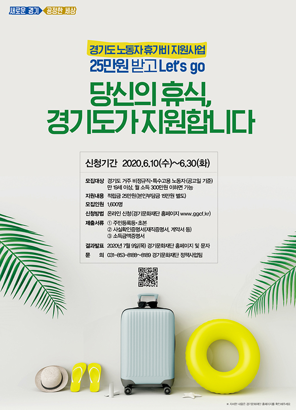 µµ³» ºñÁ¤±ÔÁ÷¡¤Æ¯¼ö°í¿ëÁ÷ ³ëµ¿ÀÚ 1,600¸í ´ë»ó¡¥1Àδç 25¸¸¿ø ÈÞ°¡ °æºñ Áö¿ø7¿ùºÎÅÍ 12¿ù±îÁö Àü¿ë ¿Â¶óÀÎ ¸ô¿¡¼ ¿©Çà µî °¢Á¾ ¹®È¿©°¡»óǰ ±¸¸Å °¡´É6¿ù 10ÀϺÎÅÍ 30ÀϱîÁö °æ±â¹®ÈÀç´Ü(www.ggcf.kr) ¿Â¶óÀÎ ½Åû°æ±âµµ(µµÁö»ç ÀÌÀç¸í)°¡ ¿ÃÇØ µµ³» ºñÁ¤±ÔÁ÷ ¶Ç´Â Ư¼ö°í¿ëÁ÷ ³ëµ¿ÀÚ 1,600¸íÀ» ´ë»óÀ¸·Î ÃÑ 4¾ï ¿ø ±Ô¸ðÀÇ ÈÞ°¡ °æºñ¸¦ Áö¿øÇÏ´Â ‘°æ±âµµ ³ëµ¿ÀÚ ÈÞ°¡ºñ Áö¿ø»ç¾÷’À» ÃßÁøÇÑ´Ù°í 8ÀÏ ¹àÇû´Ù.