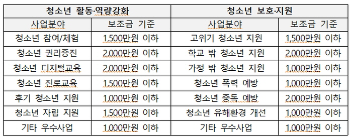 À̹ø °ø¸ð»ç¾÷Àº ÃÑ 2°³ ºÎ¹®À¸·Î ¡ãû¼Ò³â Ȱµ¿·¿ª·® °È ºÐ¾ß ¡ãº¸È£·Áö¿ø ºÐ¾ßÀ̸ç, »ó¼¼ »ç¾÷ ºÐ¾ß ¹× º¸Á¶±Ý ±âÁØÀº °¢ 7°³·Î ³ª´µ¾î ÀÖ´Ù.