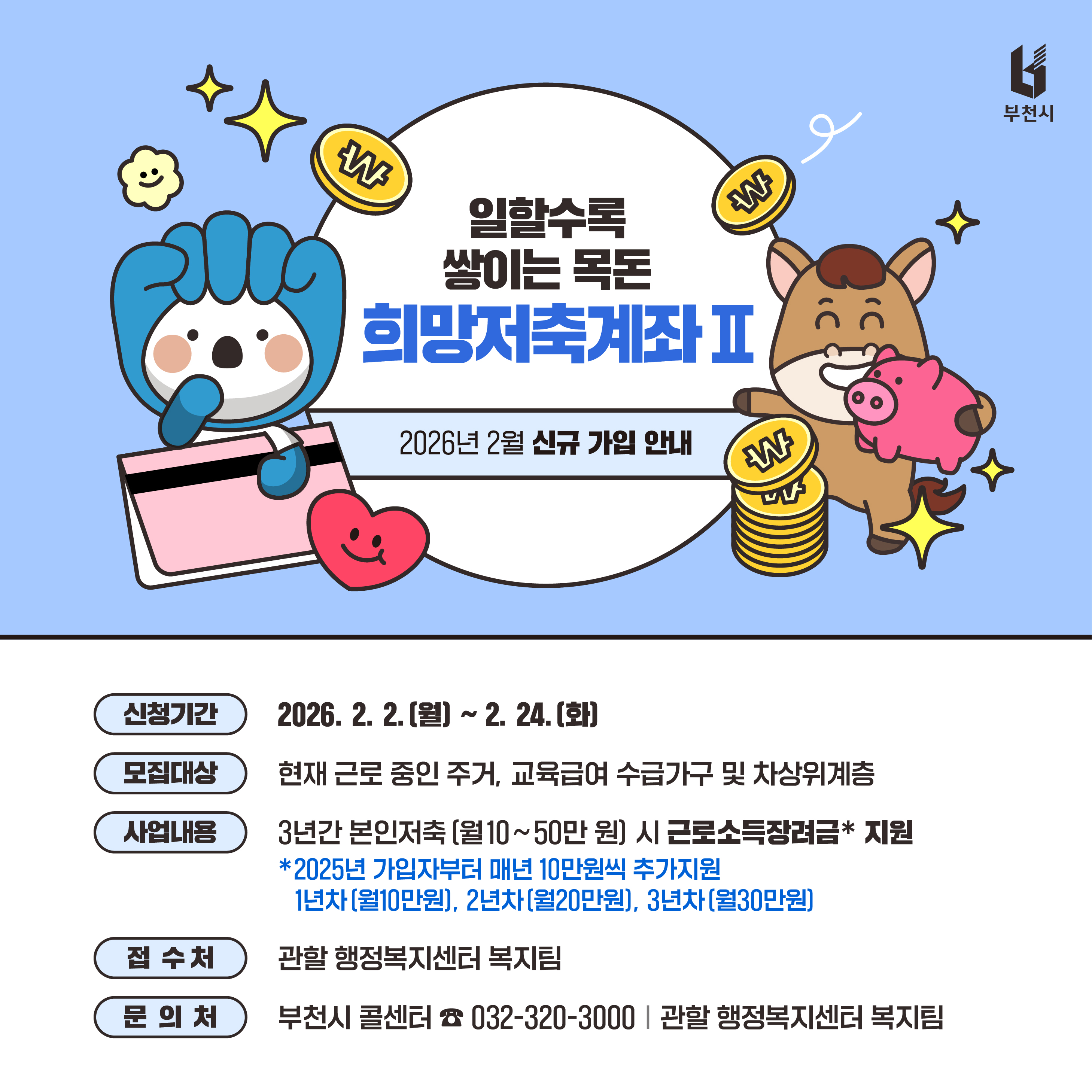 ¡°ÀÏÇÒ¼ö·Ï ½×ÀÌ´Â ¸ñµ·¡±¡¦ÀÚ»êÇü¼ºÁö¿øÀ¸·Î ÀÚ¸³¿ª·® °ÈºÎõ½Ã´Â ±Ù·Î ÁßÀÎ ÁÖ°Å․±³À°±Þ¿© ¼ö±Þ °¡±¸¿Í Â÷»óÀ§°èÃþÀÇ ÀÚ»ê Çü¼º°ú ÀÚ¸³À» Áö¿øÇϱâ À§ÇØ ‘2026³â Èñ¸ÁÀúÃà°èÁÂ(¥±)’ ½Å±Ô °¡ÀÔÀÚ¸¦ ¿À´Â 2¿ù 2ÀϺÎÅÍ 24ÀϱîÁö ¸ðÁýÇÑ´Ù°í 30ÀÏ ¹àÇû´Ù.