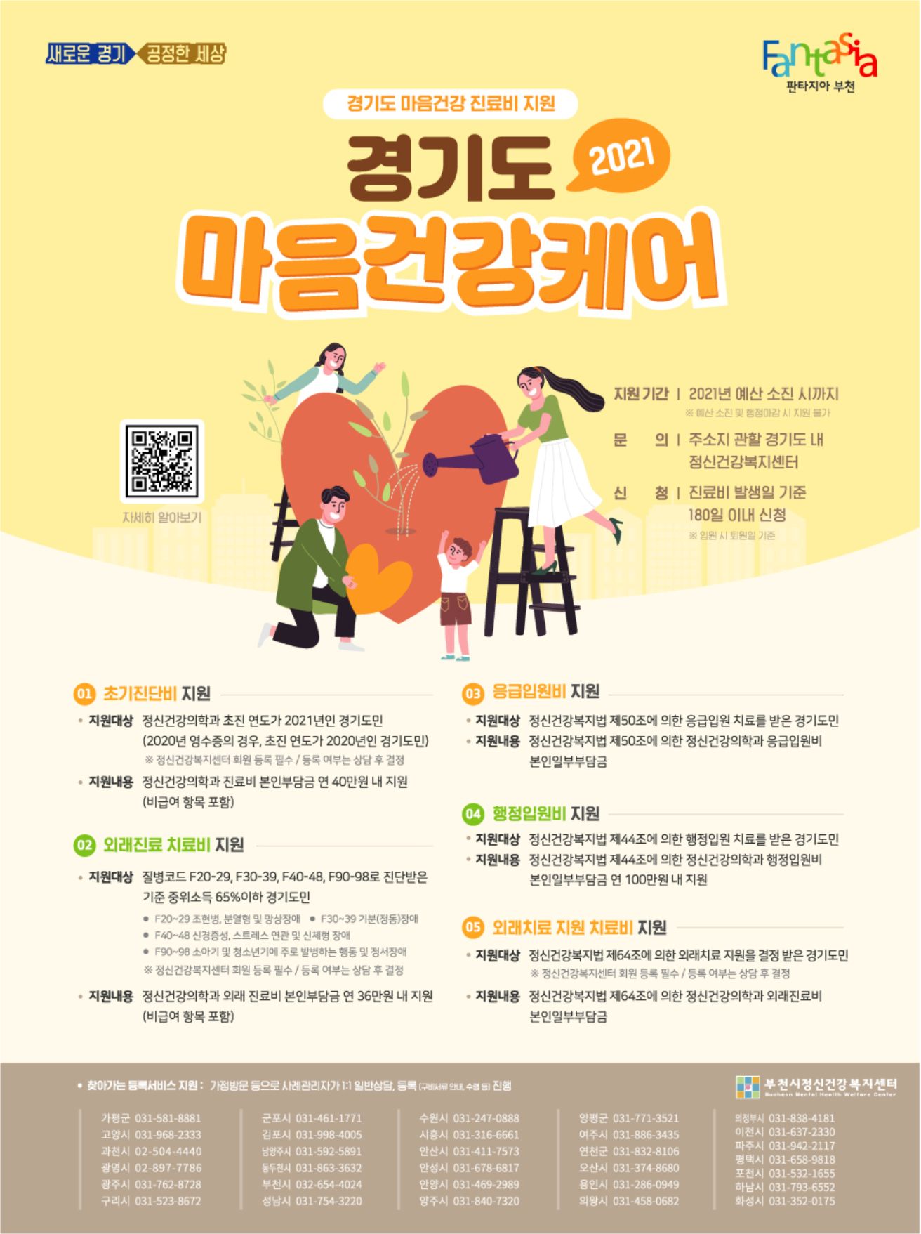¸¶À½°Ç°ÄÉ¾î »ç¾÷¿¡ °üÇÑ ÀÚ¼¼ÇÑ ¹®ÀÇ »çÇ×Àº ºÎõ½ÃÁ¤½Å°Ç°º¹Áö¼¾ÅÍ(032-654-4024, ³»¼± 681)·Î ÀüÈÇÏ¿© È®ÀÎÇÒ ¼ö ÀÖ´Ù.