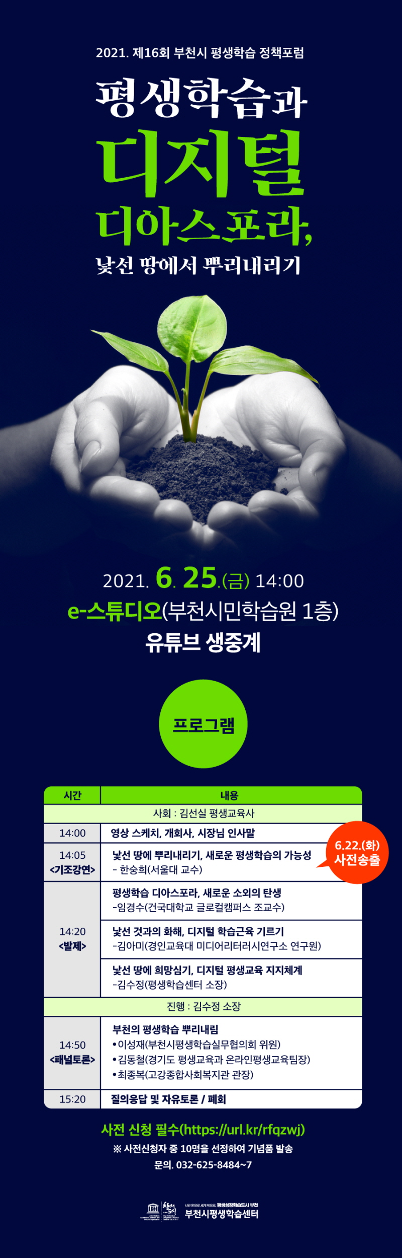 ¡°¿Â¶óÀÎ Ãë¾à°èÃþÀ» À§ÇÑ Æò»ýÇнÀÀÇ »õ·Î¿î ¹æÇâ ³íÀÇ¡±ºÎõ½Ã´Â ¿À´Â 6¿ù 25ÀÏ(±Ý) ¿ÀÈÄ 2½Ã, À¯Æ©ºê ä³Î <ºÎõ½ÃÆò»ýÇнÀ¼¾ÅÍ>¸¦ ÅëÇØ ‘Á¦16ȸ ºÎõ½Ã Æò»ýÇнÀ Á¤Ã¥Æ÷·³’À» °³ÃÖÇÑ´Ù.