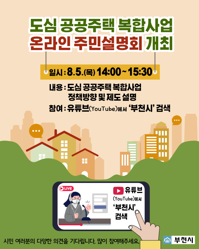 ¿À´Â 8¿ù 2ÀϱîÁö ÁúÀÇ»çÇ× »çÀü Á¢¼ö, Áֹμ³¸íȸ À¯Æ©ºê ¶óÀ̺ê ÁøÇàºÎõ½Ã´Â ‘3080+ ´ëµµ½Ã±Ç ÁÖÅðø±Þ¹æ¾È(21.2.4)’ °ü·Ã µµ½É°ø°øÁÖÅà º¹ÇÕ»ç¾÷ÀÇ 5Â÷ ¼±µµ»ç¾÷ Èĺ¸Áö·Î 5°÷(¿ª¼¼±Ç 3, Áذø¾÷ 1, ÀúÃþÁÖ°Å 1)ÀÌ ¼±Á¤µÊ¿¡ µû¶ó, »ç¾÷¿¡ ´ëÇÑ ÁÖ¹Î(ÅäÁöµî¼ÒÀ¯ÀÚ)µéÀÇ ÀÌÇØ ÁõÁøÀ» À§ÇÏ¿© ¿À´Â 8¿ù 5ÀÏ Áֹμ³¸íȸ¸¦ °³ÃÖÇÑ´Ù.