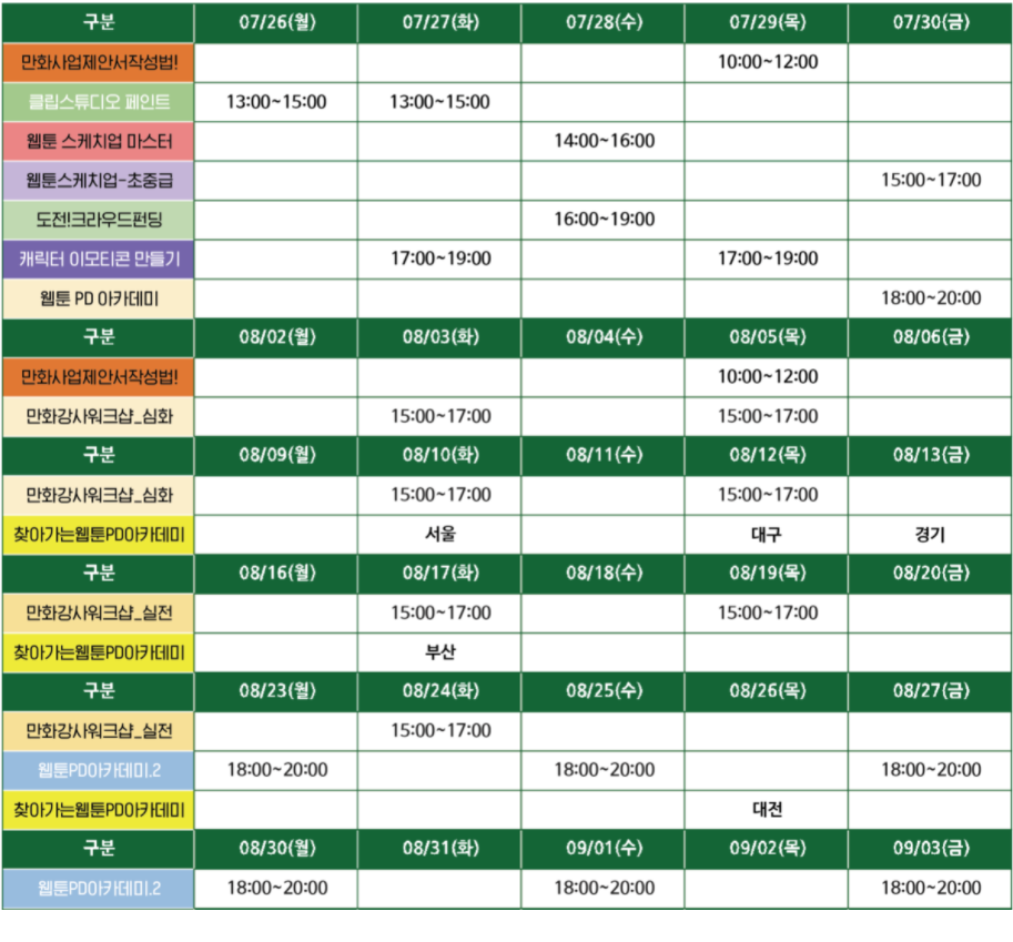Çѱ¹¸¸È­¿µ»óÁøÈï¿øÀº °úÁ¤À» ÅëÇØ ¼­¿ï, ´ë±¸, °æ±â(°í¾ç), ºÎ»ê, ´ëÀü, ±¤ÁÖ ÃÑ 6°³ ±Ç¿ª¿¡¼­ ¸¸È­ »ê¾÷°è Àη ¾ç¼ºÀ» À§ÇÑ ‘À¥Å÷PD ¾ç¼º ±³À°’À» ¿ÃÇØ »õ·Ó°Ô ¼±º¸ÀδÙ. ¸¸È­»ê¾÷ °ü·Ã Ãë¾÷À» Èñ¸ÁÇÏ´Â Çлý ¹× Ãë¾÷ Áغñ»ýµéÀÌ ½º½º·Î À¥Å÷PD·Î¼­ ÀáÀç·ÂÀ» È®ÀÎÇÏ´Â µ¿½Ã¿¡ ²ÞÀ» ÀÌ·ê ¼ö ÀÖ´Â ÁÁÀº ±âȸ°¡ µÉ °ÍÀÌ´Ù.