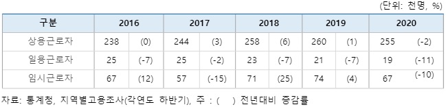 ¶ÇÇÑ ºÎõ½ÃÀÇ Áö¿ªÃÑ»ý»ê Áß °¡Àå ³ôÀº ºñÁßÀ» Â÷ÁöÇÏ´Â »ê¾÷Àº Á¦Á¶¾÷À̳ª ±× ±Ô¸ð°¡ Á¡Â÷ °¨¼ÒÇϰí ÀÖ°í »ç¾÷ü¼ö¿Í Á¾»çÀÚ¼öµµ °¨¼ÒÇÏ´Â Ãß¼¼´Ù. 2020³â Á¾»çÀÚ ÁöÀ§º° Ãë¾÷ÀÚ¼ö¸¦ »ìÆìº¸¸é Àü³â ´ëºñ »ó¿ë±Ù·ÎÀÚ°¡ 2%, ÀÏ¿ë±Ù·ÎÀÚ°¡ 11%, ÀӽñٷÎÀÚ°¡ 10% °¨¼ÒÇÏ¿© ÀÏ¿ë․ÀӽñٷÎÀÚ°¡ »ó¿ë±Ù·ÎÀÚ¿¡ ºñÇØ Ÿ°ÝÀ» ¸¹ÀÌ ¹ÞÀº °ÍÀ¸·Î ³ªÅ¸³µ´Ù. 2020³âÀº Äڷγª ¿µÇâÀ¸·Î °í·ÉÀÚ¸¦ Á¦¿ÜÇÑ Àü ¿¬·É´ë¿¡¼ Ãë¾÷ÀÚ ¼ö°¡ °¨¼ÒÇÏ°í ³²¼º¿¡ ºñÇØ ¿©¼ºÀÌ, »ó¿ë±Ù·ÎÀÚ º¸´Ù ÀÏ¿ë․ÀӽñٷÎÀÚ°¡ Å«ÆøÀ¸·Î °¨¼ÒÇß´Ù.