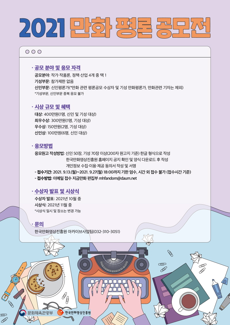 ¸¸ÈÆò·Ð °ø¸ðÀü °³ÃÖ - ÃÑ»ó±Ý 1,600¸¸¿ø, 9¿ù 27ÀϱîÁö À̸ÞÀÏ Á¢¼ö ÁøÇàÇѱ¹¸¸È¿µ»óÁøÈï¿ø(¿øÀå ½ÅÁ¾Ã¶)Àº Çѱ¹¸¸È¿¡ ´ëÇÑ °ü½É°ú ¼Òºñ¸¦ Á¦°íÇϰí, ¸¸ÈÀÛǰ Æò·ÐÀ» Ȱ¼ºÈÇϱâ À§ÇØ ‘2021 ¸¸ÈÆò·Ð °ø¸ðÀü’À» °³ÃÖÇÑ´Ù°í ¹àÇû´Ù. À̹ø °ø¸ðÀüÀº ±âÁ¸ ÁöÁ¤µÈ ÀÛǰ¿¡ ´ëÇÑ Æò·Ð °ø¸ð ¹æ½Ä¿¡¼ ¹þ¾î³ª 4°³ ºÐ¾ß Áß ¼±ÅÃÇÏ¿© ÀÚÀ¯ ÁÖÁ¦·Î Âü¿©ÇÒ ¼ö ÀÖ´Ù.