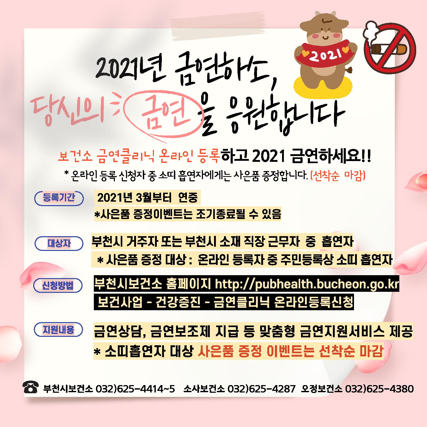 ºÎõ½Ãº¸°Ç¼Ò ±Ý¿¬»ó´ã½Ç¿¡¼­´Â ±Ý¿¬À» ¿øÇÏ´Â ½Ã¹ÎÀ» ´ë»óÀ¸·Î »çÀü¿¹¾àÀ» ÅëÇØ 1:1 ±Ý¿¬»ó´ãÀ» ÁøÇàÇϰí ÀÖ´Ù. ¿Â¶óÀÎ ½Åû¹æ¹ýÀº ºÎõ½Ãº¸°Ç¼Ò ȨÆäÀÌÁö (https://pubhealth.bucheon.go.kr)>º¸°Ç»ç¾÷>°Ç°­ÁõÁø>±Ý¿¬Å¬¸®´Ð ¿Â¶óÀεî·Ï½Åû¿¡¼­ º»ÀÎÀÎÁõ ÈÄ ½ÅûÇÏ¸é µÈ´Ù.