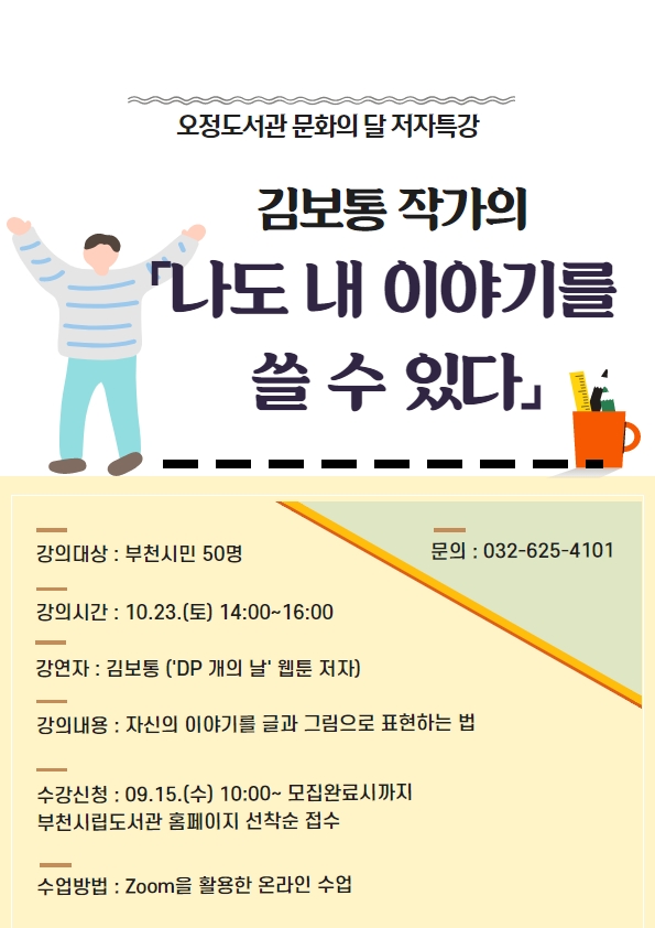 ºÎõ½Ã ¿ÀÁ¤µµ¼°üÀº 10¿ù ¹®ÈÀÇ ´Þ°ú ºÏÆä½ºÆ¼¹ú °³ÃÖ¸¦ ¸Â¾Æ ¸¸È ƯÈÁÖÁ¦¿¡ ºÎÇÕÇÑ ÀÛ°¡¸¦ ÃÊÃ»ÇØ ´Ù¾çÇÑ ÄÜÅÙÃ÷¸¦ Ȱ¿ëÇÑ Á¤º¸ ±³À°°ú ±Û¾²±â âÀÛ µîÀÇ Ã¼ÇèȰµ¿À» ÁøÇàÇÑ´Ù.