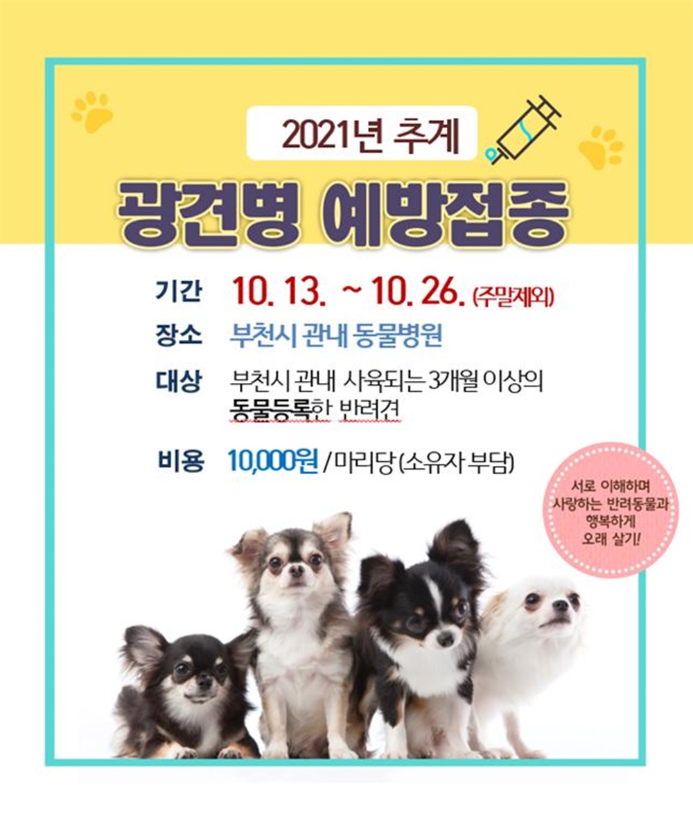 µ¿¹°À» ÅëÇØ ±¤°ßº´¿¡ »ç¶÷µµ °¨¿°µÉ ¼ö ÀÖ´Â ¸¸Å ½Ã´Â ¸Å³â º½, °¡À» µÎ Â÷·Ê¿¡ °ÉÃÄ ±¤°ßº´ ¿¹¹æÁ¢Á¾À» ½Ç½ÃÇϰí ÀÖ´Ù. ¹Ý·Á°ßÀº ±¤°ßº´ ¿¹¹æÀ» À§ÇØ ¸Å³â 1¹ø¾¿ º¸° Á¢Á¾À» ÇØ¾ßÇÑ´Ù.