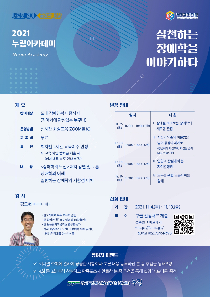 11¿ù 25ÀϺÎÅÍ ¸ÅÁÖ ¸ñ¿äÀÏ, °æ±âµµ ³» Àå¾ÖÀκ¹Áö Á¾»çÀÚ ´ë»ó ¡®2021 ´©¸² ¾ÆÄ«µ¥¹Ì-½ÇõÇÏ´Â Àå¾ÖÇÐÀ» À̾߱âÇÏ´Ù¡¯ ÁøÇàÀå¾Ö¸¦ ¹Ù¶óº¸´Â »õ·Î¿î »çȸÀû °üÁ¡ ¼Ò°³, Àå¾ÖÇÐÀû °üÁ¡¿¡ ±â¹ÝÇÑ ¼ºñ½º ½Çõ ¹æ¾È ¸ð»ö°æ±âµµÀå¾ÖÀκ¹ÁöÁ¾ÇÕÁö¿ø¼¾ÅÍ(ÀÌÇÏ ´©¸²¼¾ÅÍ)´Â 11¿ù 25ÀÏ(¸ñ)ºÎÅÍ 4ȸ¿¡ °ÉÃÄ ¸ÅÁÖ ¸ñ¿äÀÏ ‘2021 ´©¸² ¾ÆÄ«µ¥¹Ì’¸¦ ¿Â¶óÀÎÀ¸·Î ÁøÇàÇÑ´Ù.