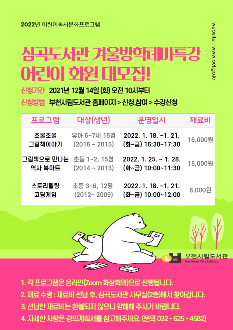 Á¢¼ö´Â 12¿ù 14ÀÏ È¿äÀÏ ¿ÀÀü 10½ÃºÎÅÍ ºÎõ½Ã¸³µµ¼°ü ȨÆäÀÌÁö(www.bcl.go.kr)¿¡¼ ¼±Âø¼øÀ¸·Î ÁøÇàµÈ´Ù.