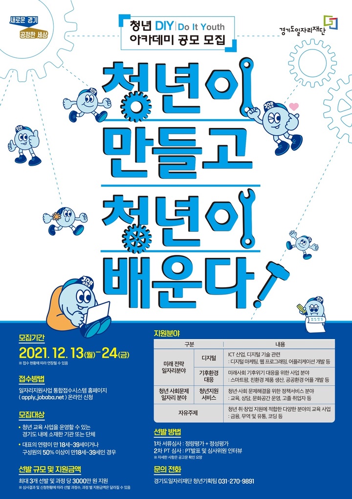 12¿ù 13ÀϺÎÅÍ 24ÀϱîÁö ÀÏÀÚ¸®Áö¿ø»ç¾÷ ÅëÇÕÁ¢¼ö½Ã½ºÅÛÀ» ÅëÇØ ½Åû °¡´ÉÆò°¡ ÀüÇü ½É»ç °á°ú¸¦ Åä´ë·Î 3°³ °úÁ¤À» ¼±Á¤, °úÁ¤º°·Î ÃÖ´ë 3õ¸¸ ¿ø±îÁö Áö¿ø°æ±âµµÀÏÀÚ¸®Àç´ÜÀÌ Ã»³âÀÌ ±âȹÇϴ û³â ´ë»ó ±³À°°úÁ¤ÀÎ ‘û³â DIY(Do It Youth)’ ¾ÆÄ«µ¥¹Ì °ø¸ðÀü Âü¿© ±â°üÀ» 13ÀϺÎÅÍ ¿À´Â 24ÀϱîÁö ¸ðÁýÇÑ´Ù.